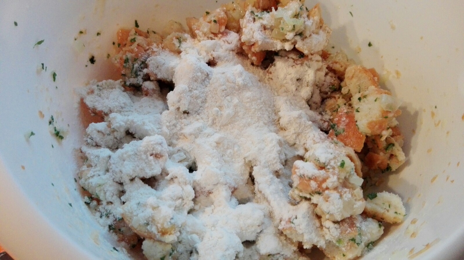 Mehl dazu geben und nun alles gut vermischen. Die entstandene Masse sollte etwas klebrig sein.