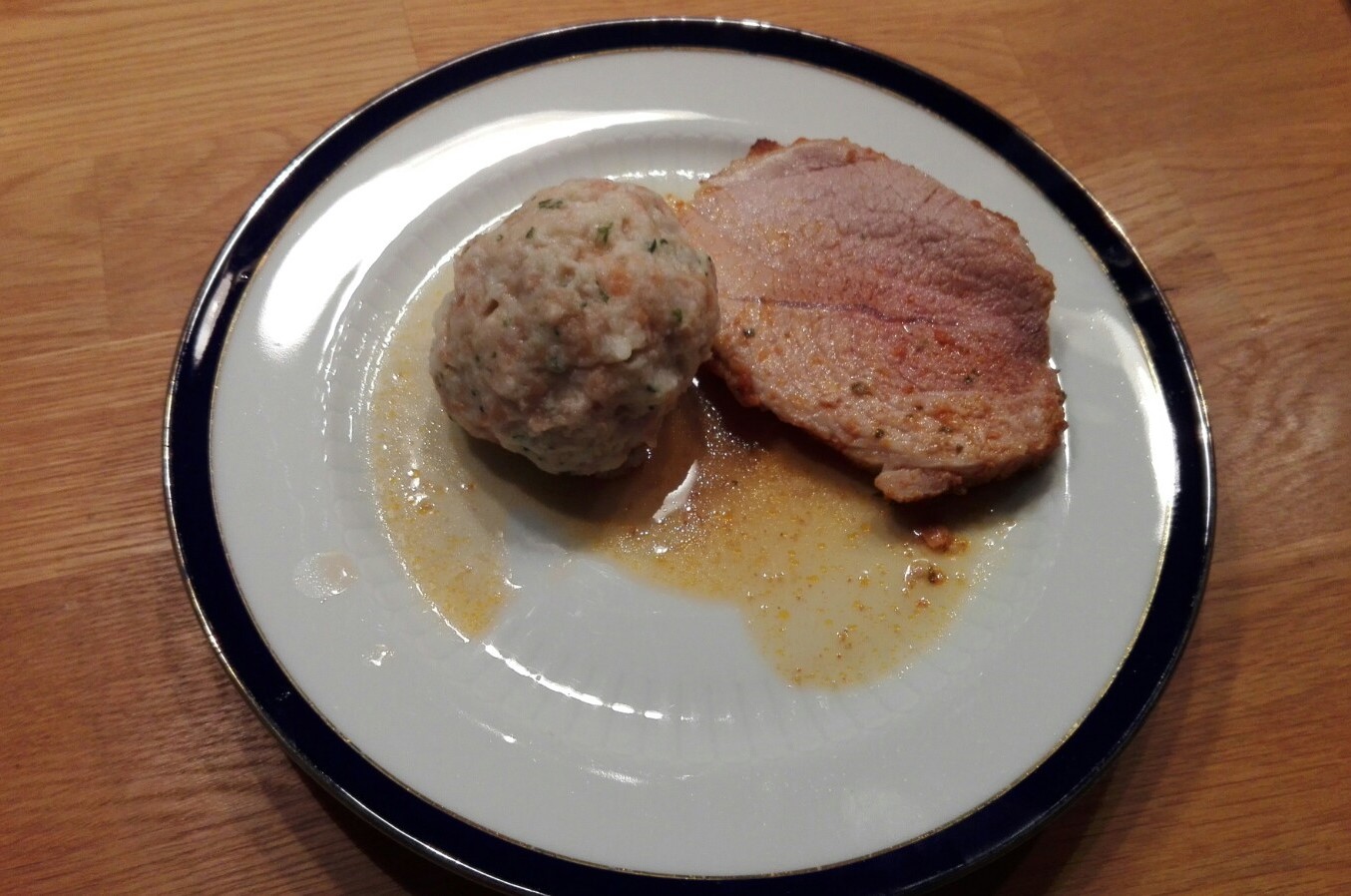 Wer mich privat kennt, weiß das ich Eier nur in bestimmten Formen mag. Und so wie ich den Serviettenkloß kannte, war er mit Eier durchdrängt und auch von der Farbe richtig gelb.