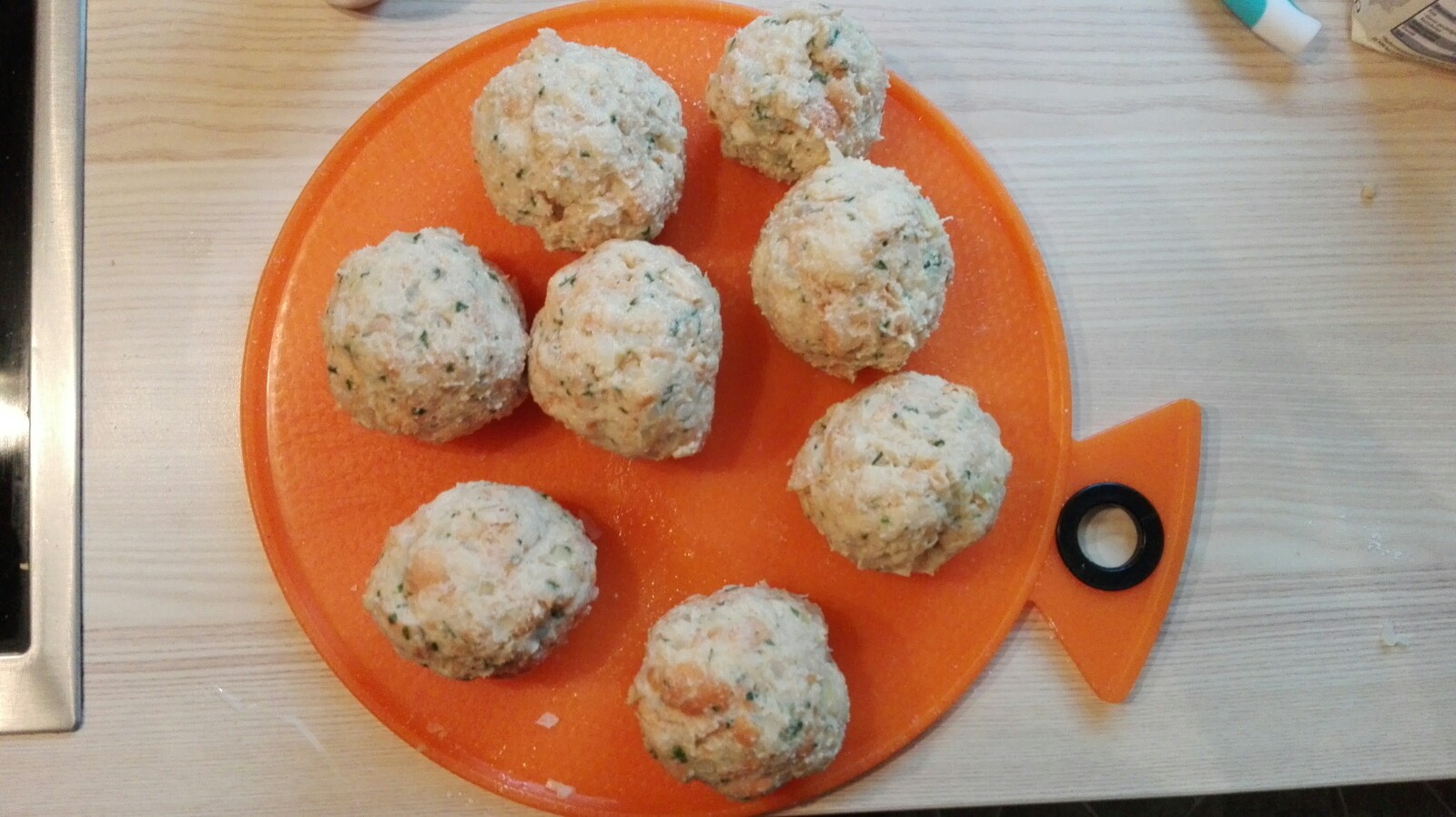 Eine Schüssel mit Wasser bereit stellen. Hände befeuchten und nun aus der Masse Tennisballgroße Knödel formen. Auf einem Teller ablegen, Hände wieder befeuchten usw….