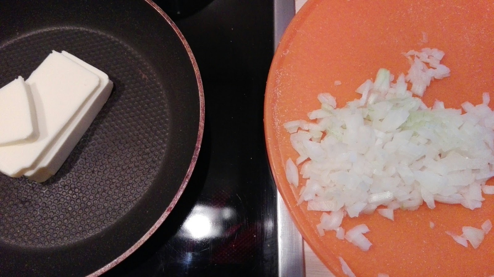 Nun die Zwiebel schälen und in kleine Würfel schneiden. Butter in einer kleinen Pfanne schmelzen und dann die Zwiebeln darin andünsten.