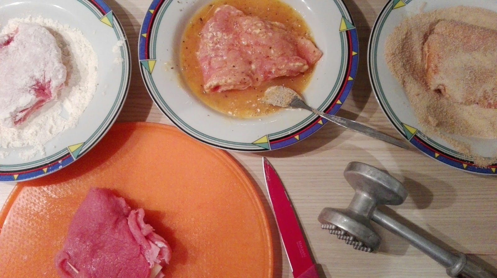 Die Schnitzel abwaschen und dann einzeln mit dem Fleischklopfer vorsichtig platt klopfen.