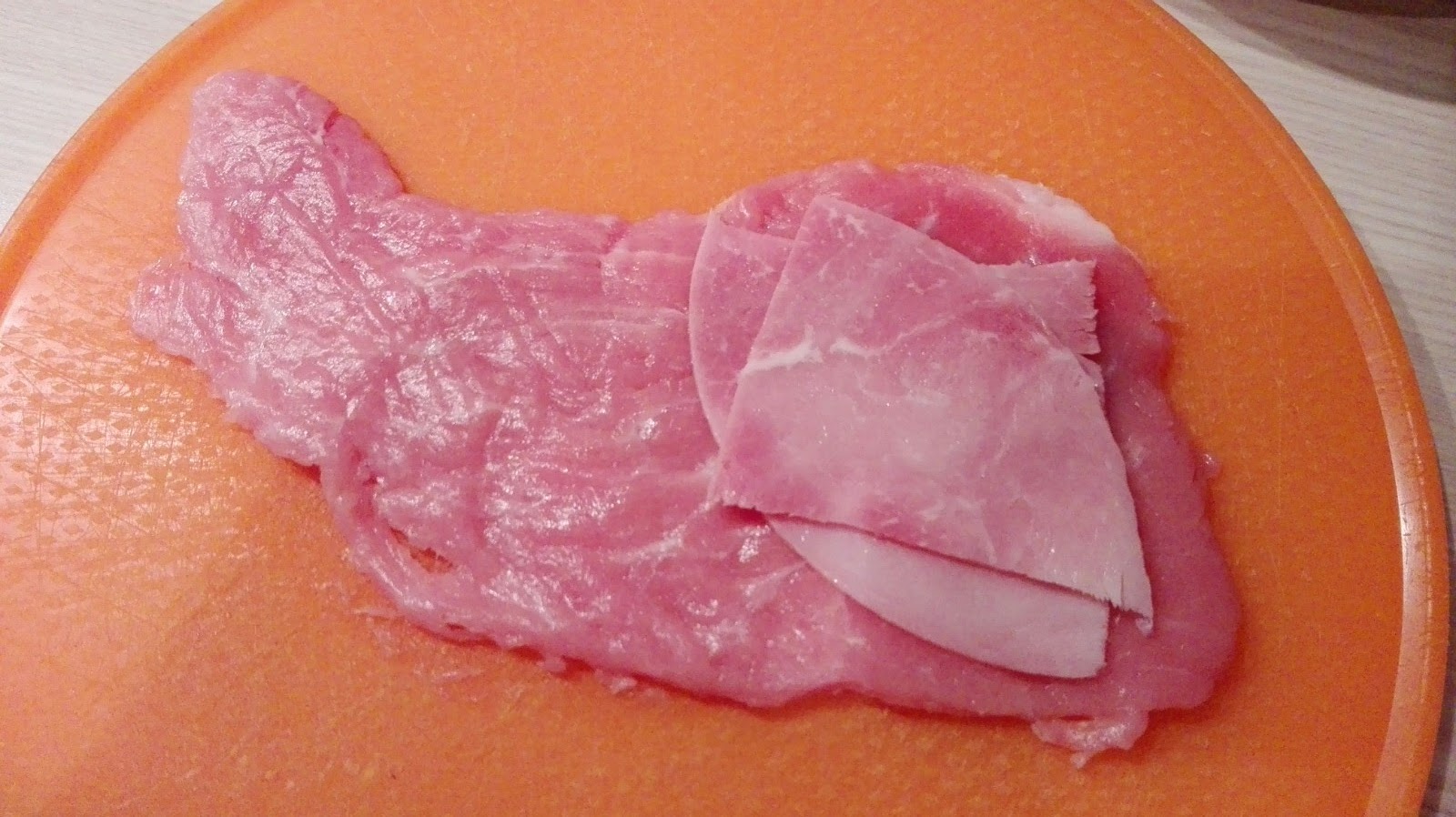 Schinken und Käse auf eine Seite des Schnitzels legen, die andere Seite nun darauf legen. Dabei darauf achten, dass die beiden Seiten gut aufeinanderliegen, damit dann später kein Käse herausläuft.