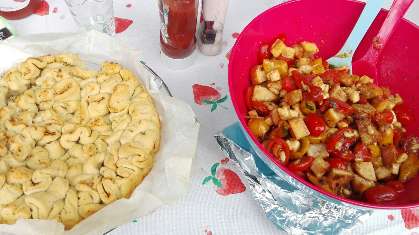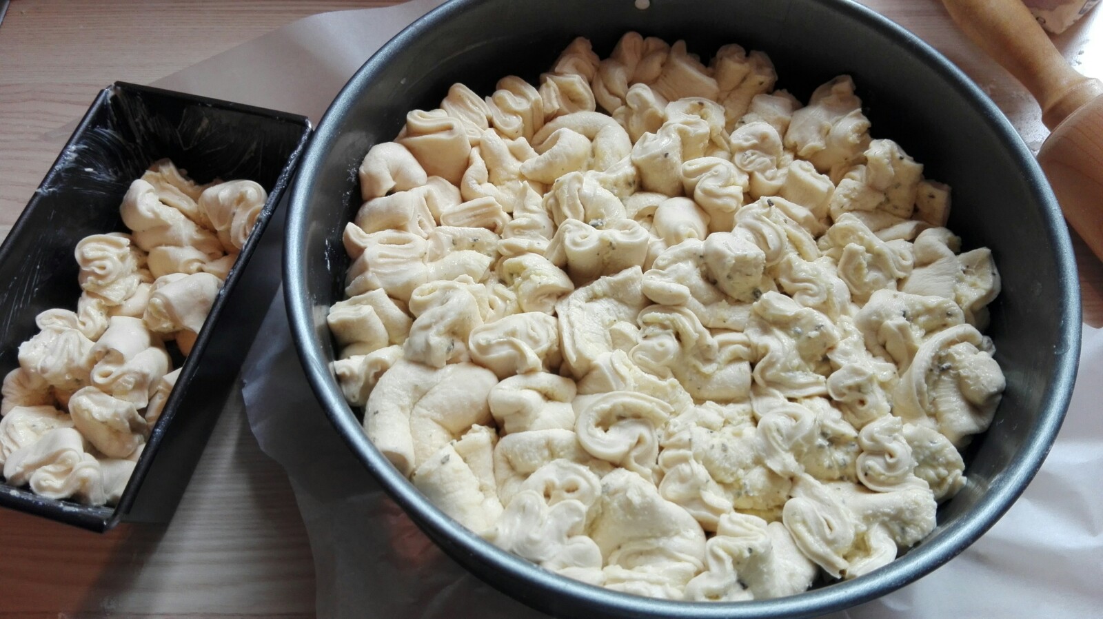 Für eine 26er Springform (ich hatte es nicht eng genug gelegt, daher habe ich noch eine kleine Form mit Zupfbrot gehabt)