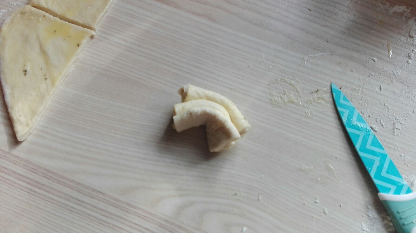 Kräuterbutter leicht anwärmen, dann lässt sie sich besser verstreichen. Nun den Teig in Teigstücke schneiden und zusammenfalten.