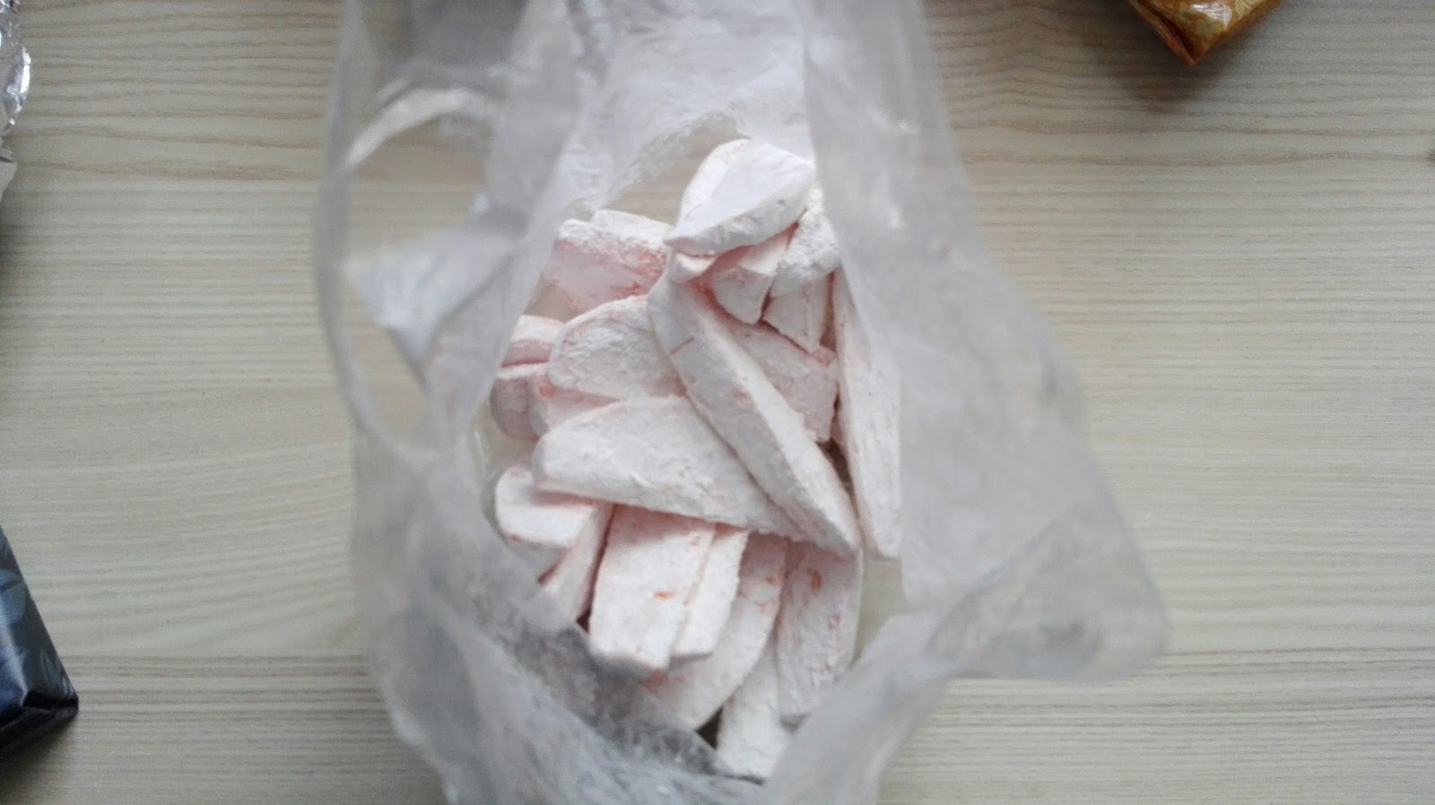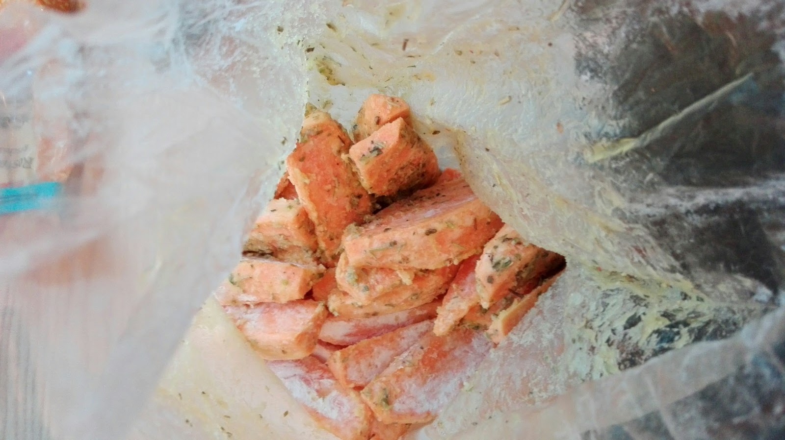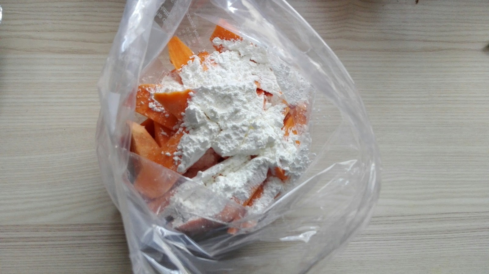 Die Süßkartoffeln dann mit einem Küchentuch abtropfen damit sie nicht mehr nass sind. Die Kartoffeln in einen Gefrierbeutel geben und Speisestärke einfüllen.