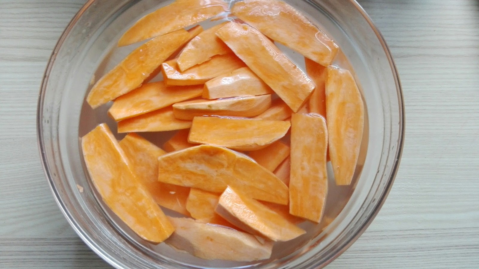 Eine Schale mit kaltem Wasser bereit stellen. Die Süßkartoffeln in Streifen schneiden und diese in das Wasser legen.
