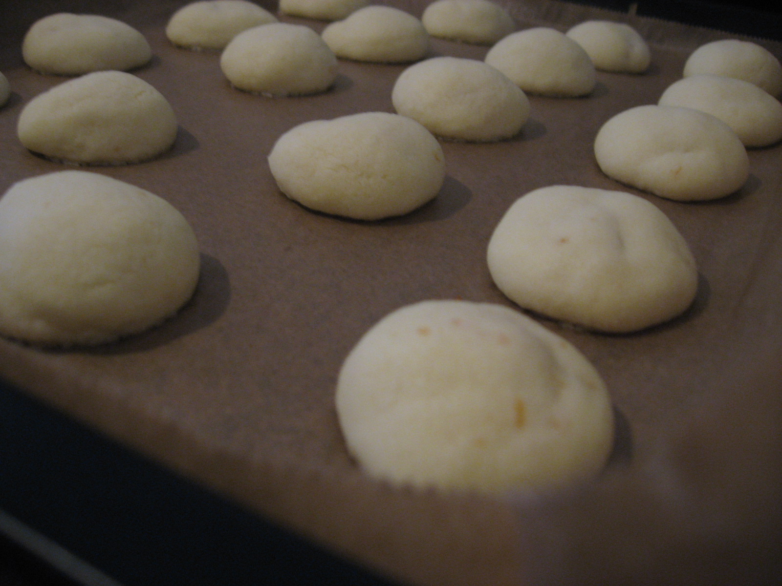 Kurz durchkneten und dann zu kleinen Kugeln formen. Diese dann zwischen den Handballen flach drücken, etwas geröstete Kokosflocken hineingeben, zudrücken und dann wieder zu einer Kugel formen und auf ein mit Backpapier ausgelegtes Backblech legen. Etwas Abstand lassen, denn die Kugeln verlaufen etwas.
