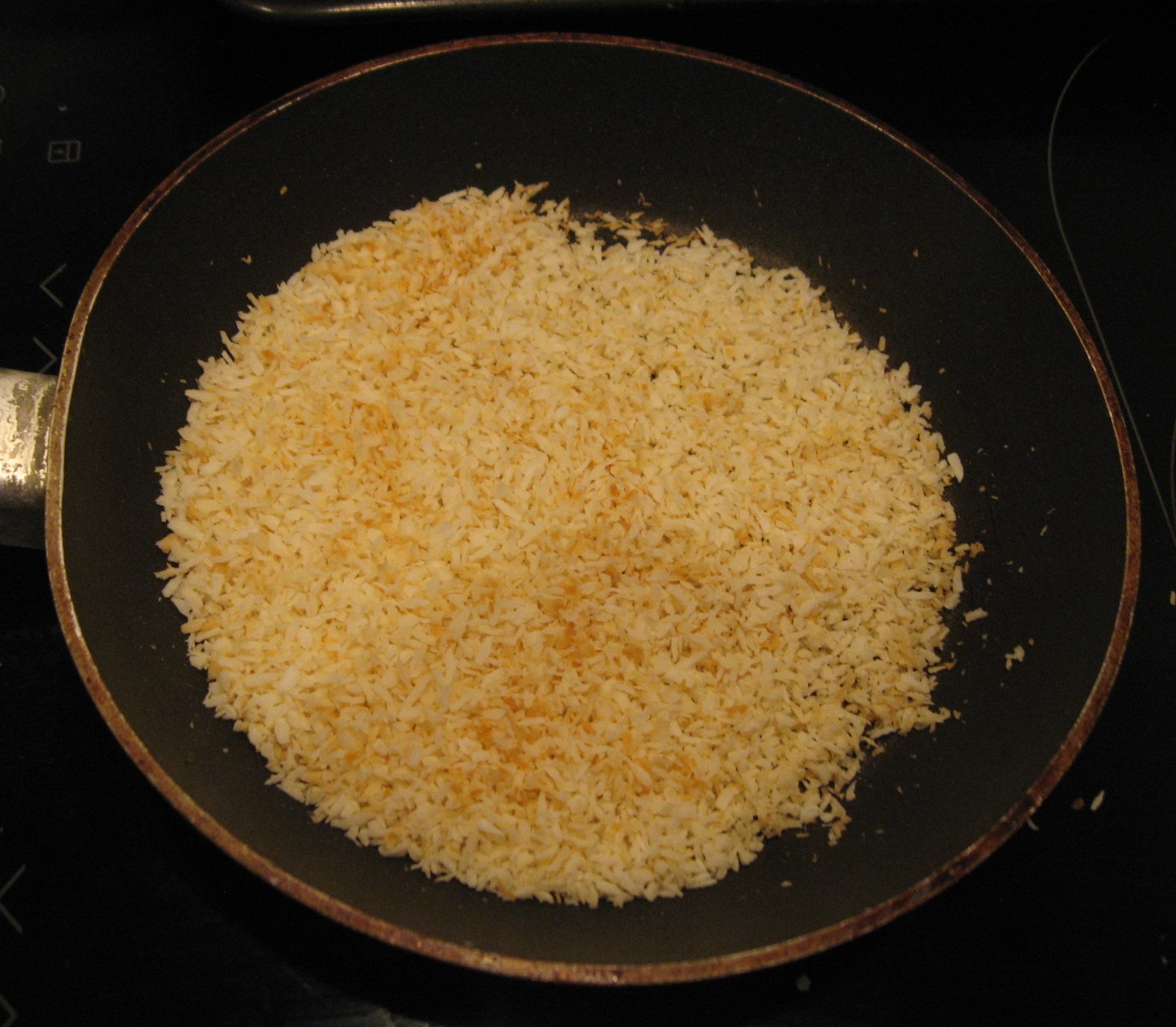 Die Kokosflocken ohne Fett in einer Pfanne goldbraun anbraten.