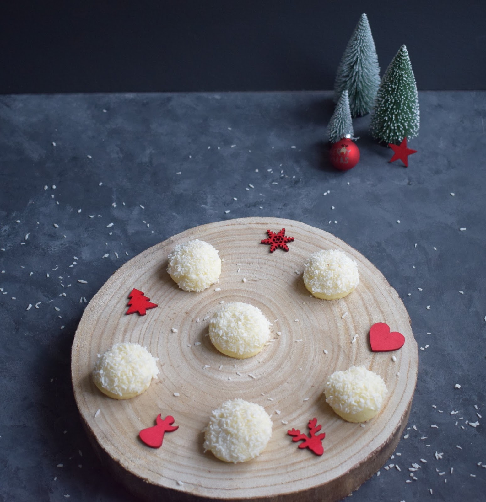 Um trotzdem ein bisschen das Gefühl von weißen Weihnachten zu verbreiten gibt es diese Kokos-Schneebälle. Wenn wir schon keine Richtigen bauen können.