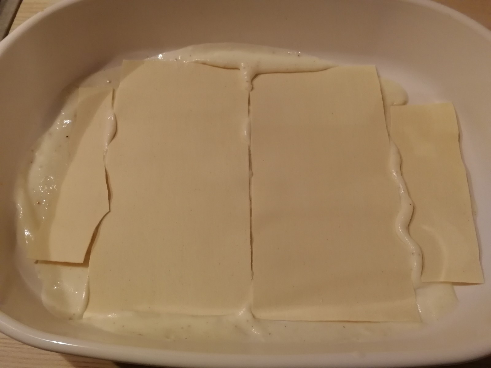 Darauf eine Schicht Lasagneplatten verteilen. Darauf achten, dass diese nicht überlappen, sonst werden sie nicht richtig durch.