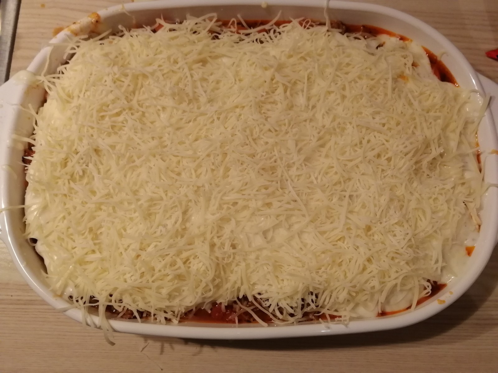 Auf die Soße nun den Käse streuen und dann für ca. 35-40 Minuten im Ofen goldbraun backen.