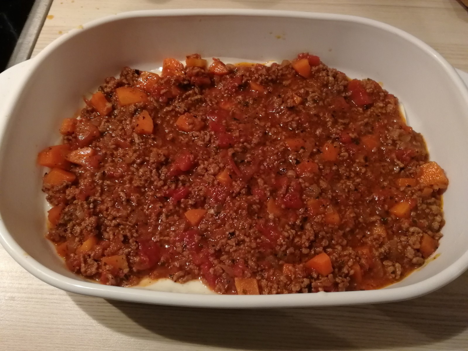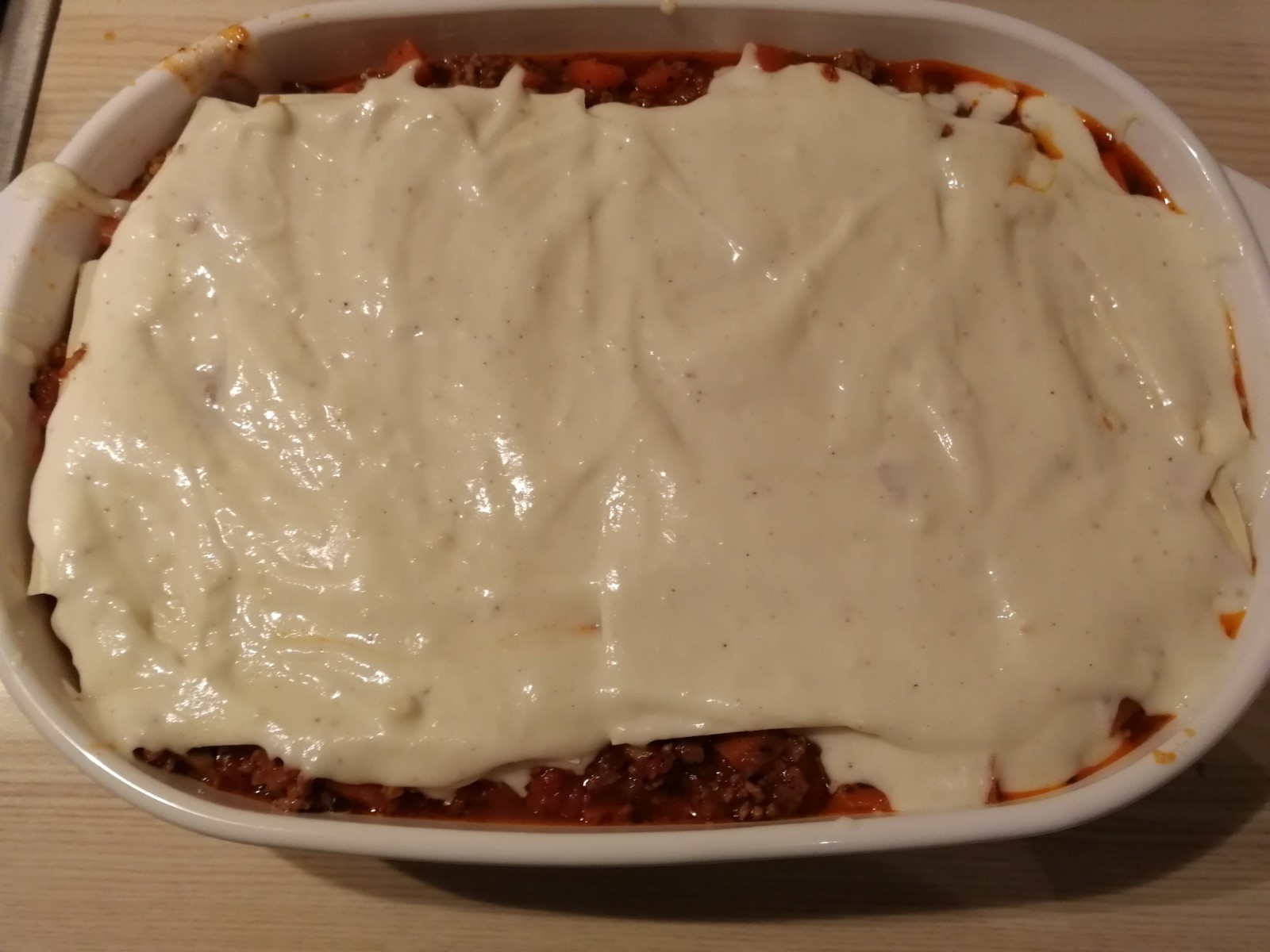 Dann wieder mit Béchamelsauce anfangen und so lange fortfahren bis alle Zutaten aufgebraucht sind, jedoch mit Lasagneplatten und Béchamelsauce abschließen.