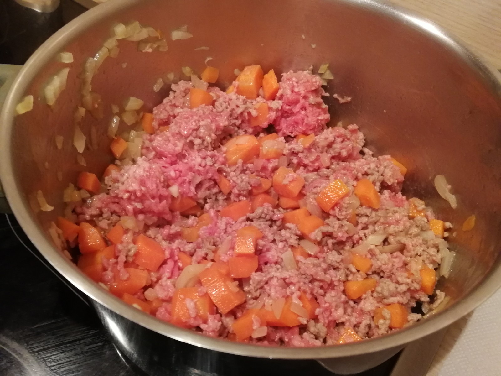 Öl in einem Topf erhitzen und darin Zwiebeln und Knoblauch andünsten. Karotten dazu geben und mit anbraten. Hackfleisch dazu geben und krümelig anbraten.