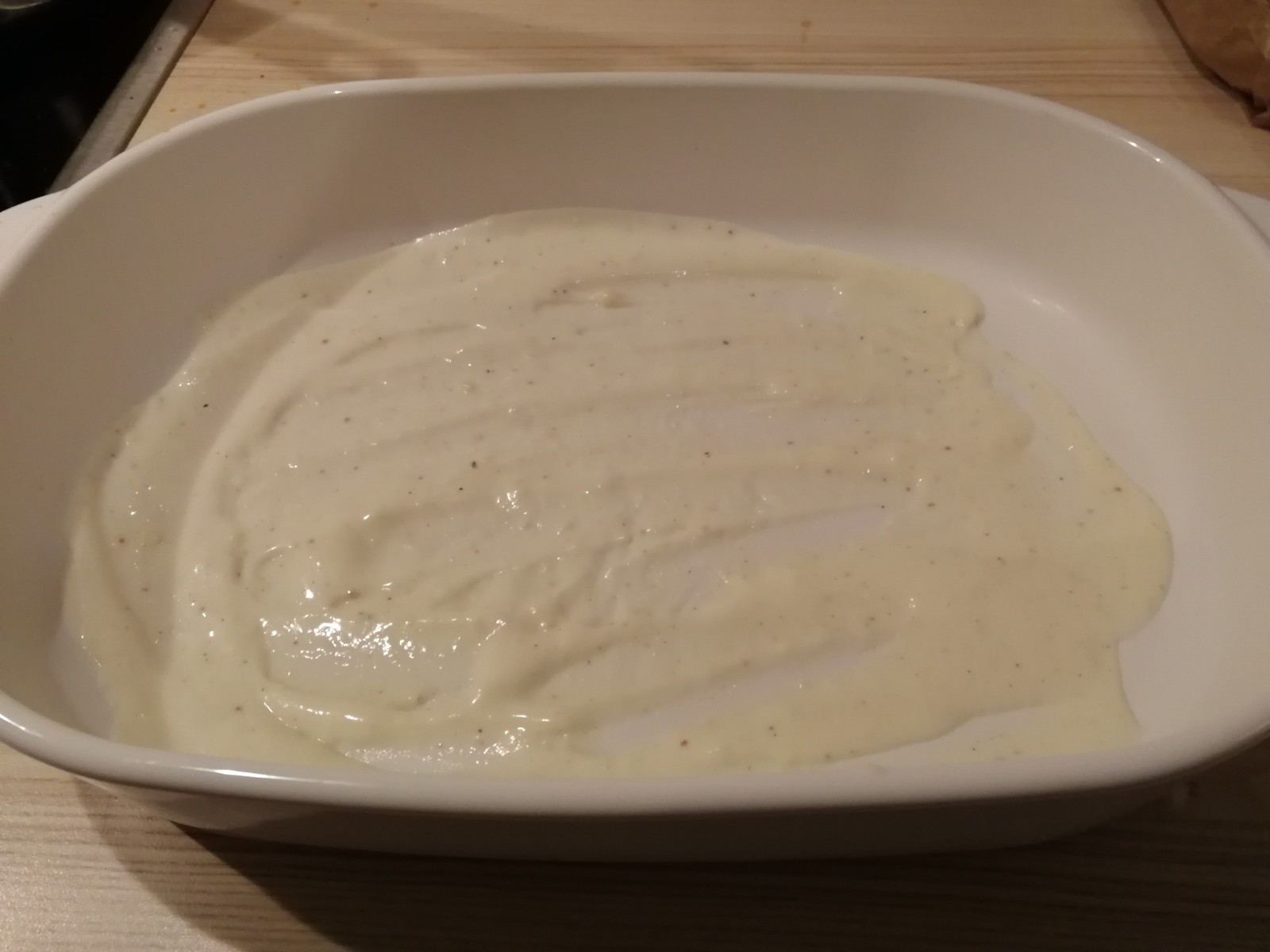 Eine Auflaufform bereit stellen. Den Boden mit etwas Béchamelsauce bestreichen.