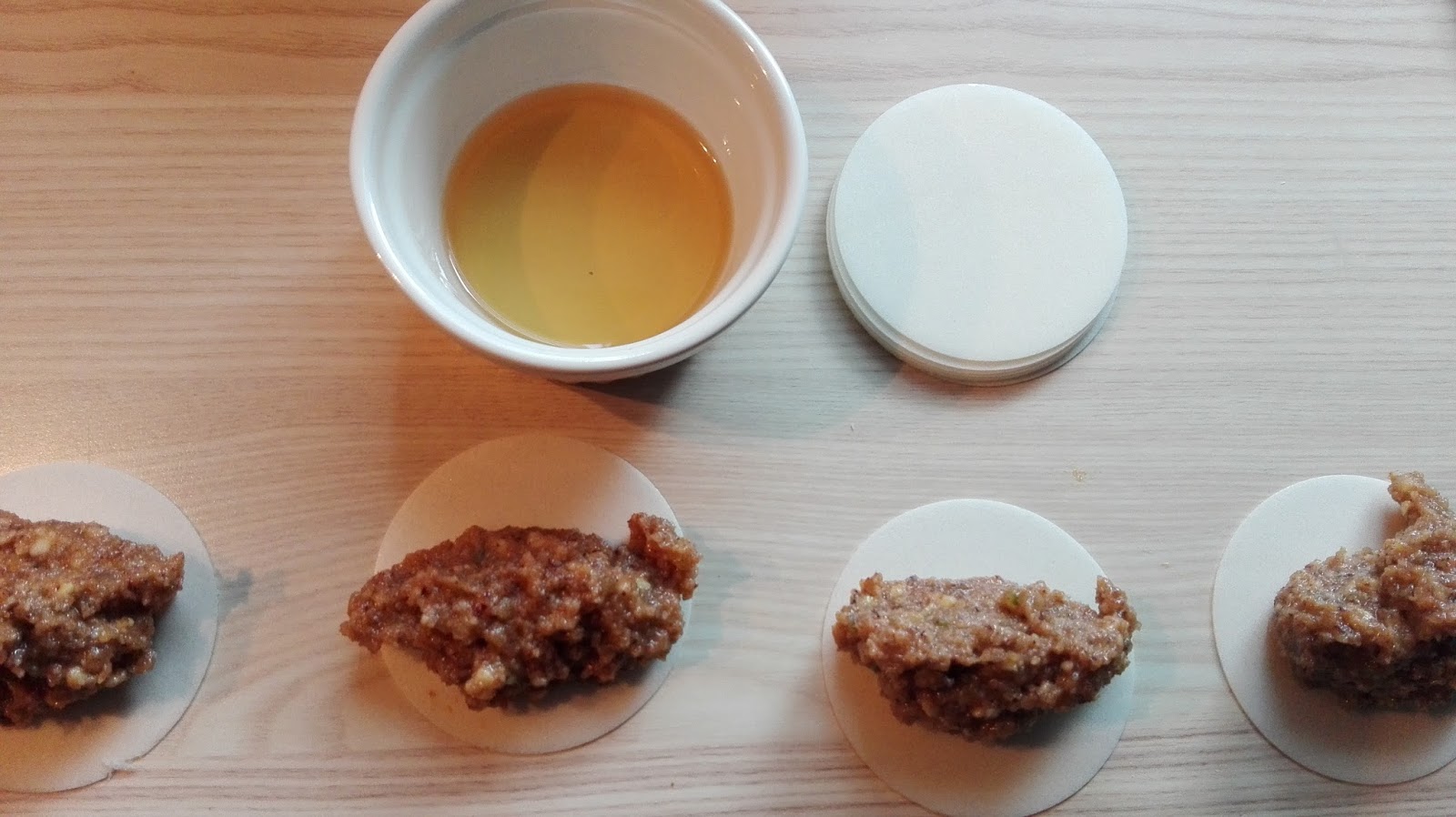 Nun die Oblaten vorbereiten und mit zwei Löffeln etwas Masse auf dem Oblaten verteilen. Ich nehme immer etwas Rum in eine kleine Schüssel und tauche den Löffel oder Spatel etwas darin ein, damit ich eine glatte Oberfläche hinbekomme bzw. sich diese gut auf der Oblate verteilen lässt.