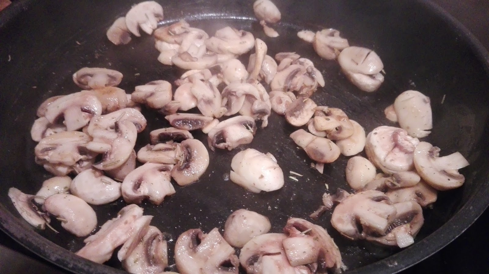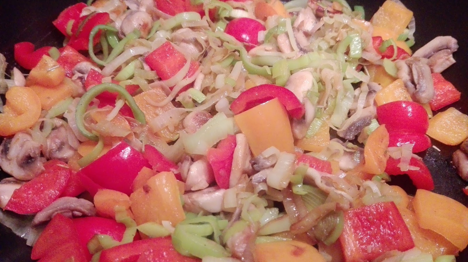 Nun das Gemüse in einer Pfanne mit 1 EL Butter anbraten. Mit den Champignons beginnen und anschließend das restliche Gemüse dazugeben. Zum Schluss Knoblauch dazugeben und mit Salz, Pfeffer und Gewürzen abschmecken.