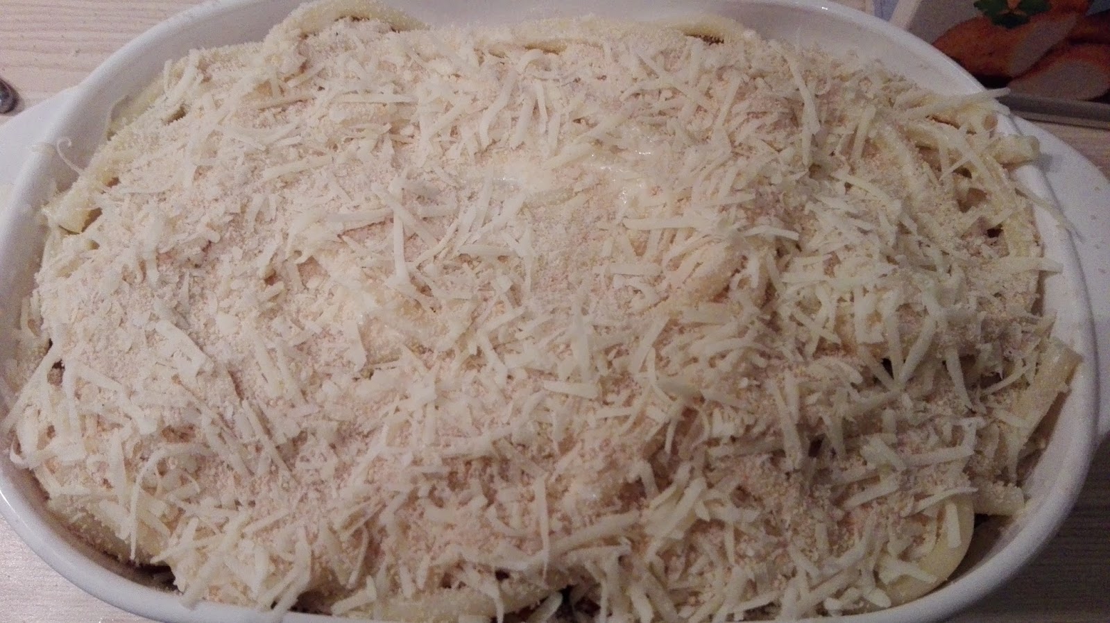 Den restlichen Käse mit den Semmelbröseln vermischen und auf der Soße verteilen.