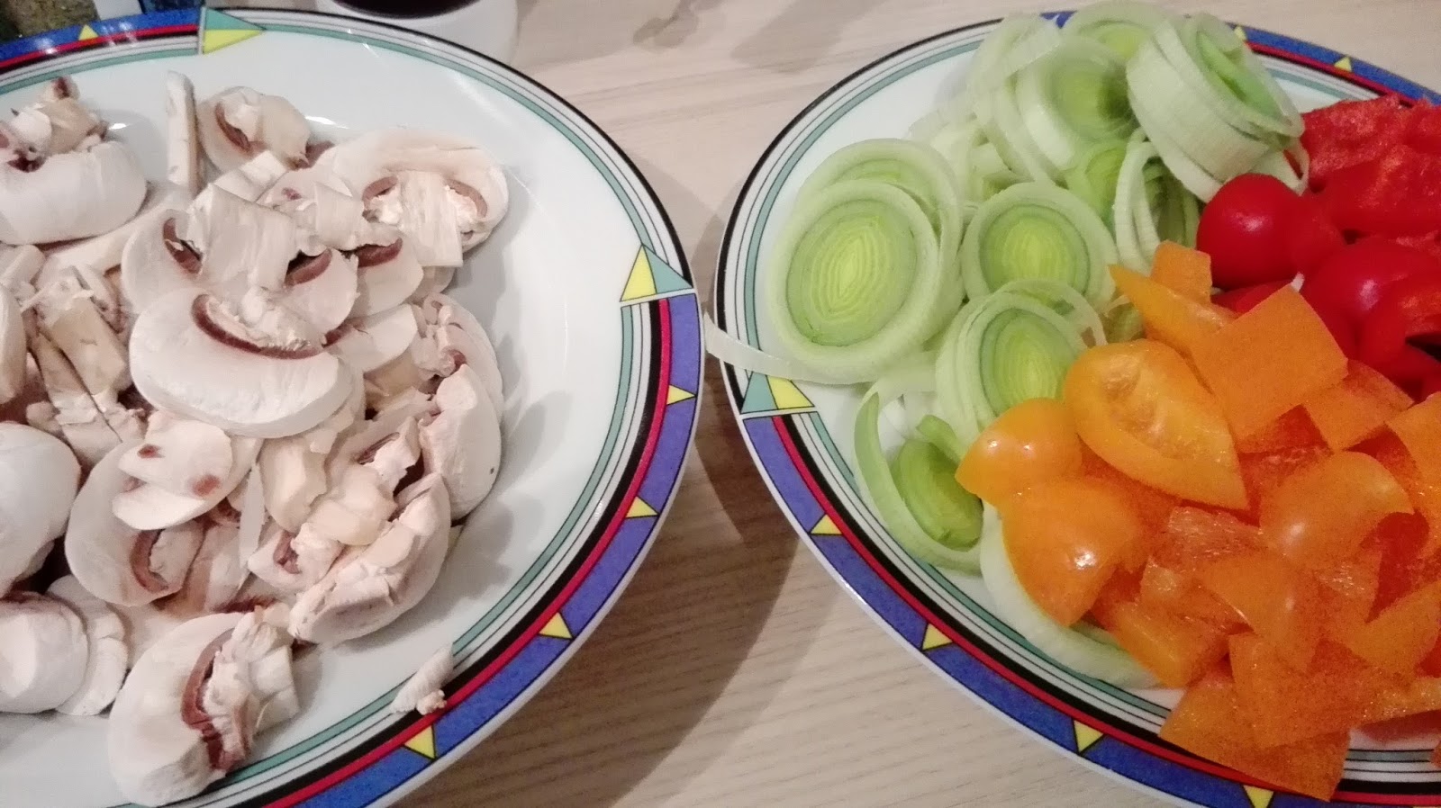 Paprika würzfeln, Lauch in Scheiben schneiden und Champignons putzen und ebenfalls in Scheiben schneiden.