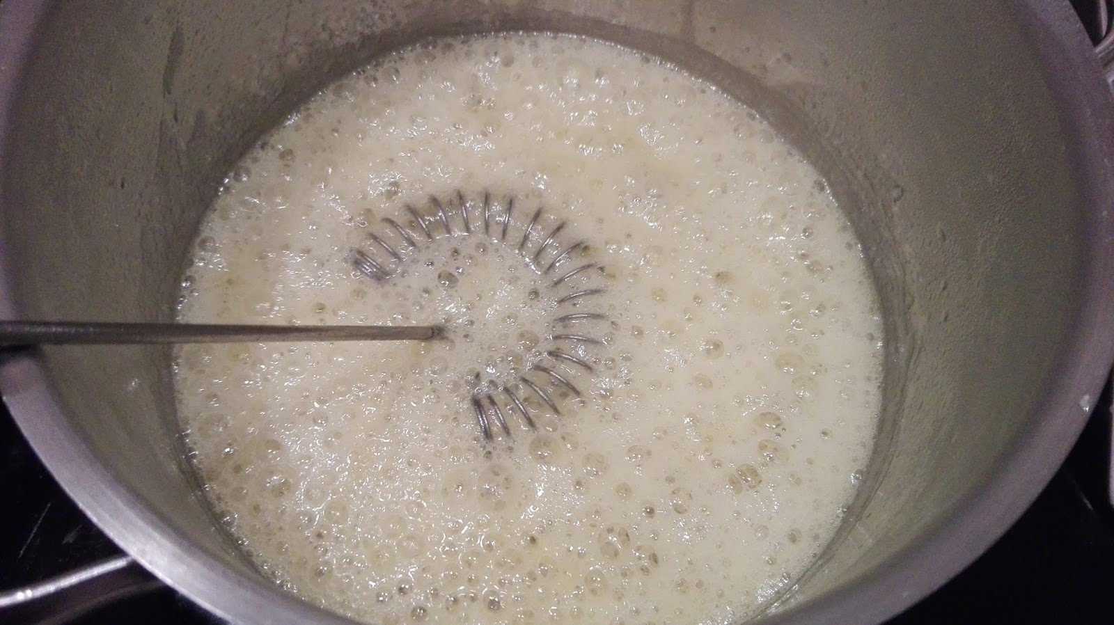 Für die Béchamel Soße die 3 EL Butter in einem Topf schmelzen lassen. Das Mehl dazugeben und unter rühren anbräunen. Nun unter weiteren Rühren die Milch nach und nach dazugeben und nun auf kleiner Hitze köcheln.