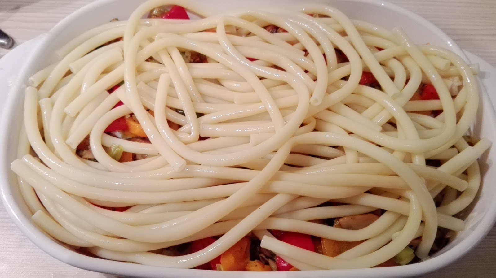 Die halbe Menge Nudeln in eine Auflaufform geben. Hälfte der Béchamel darüber geben und mit dem gesamten Gemüse bedecken. Restliche Makkaroni darüber geben und mit Soße abschließen.