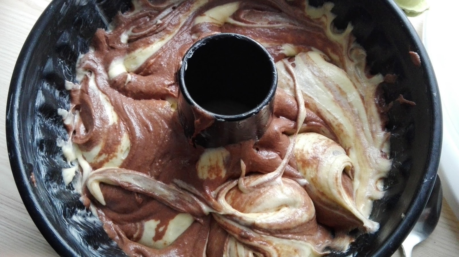 Nun den dunklen Teig in die Form geben und die beiden Teige mit der Gabel verrühren, so dass das typische Mamorkuchenmuster entsteht.