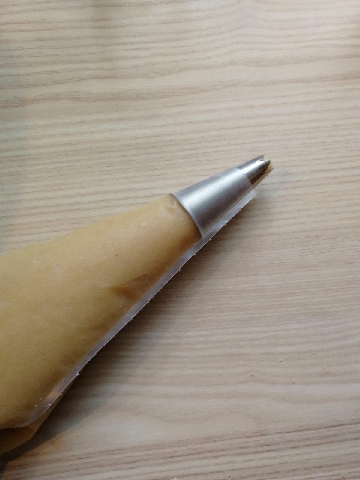Teig in einen Spritzbeutel (ich hatte mich für einen Einwegbeutel entschieden, da die Masse sehr klebt) mit Sterntülle geben und ein beliebiges Keksmuster auf das Blech spritzen. Ich hatte mich für 8er entschieden. Aber hier sind der Fantasie keine Grenzen gesetzt.