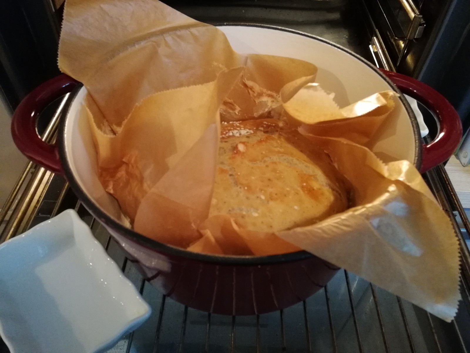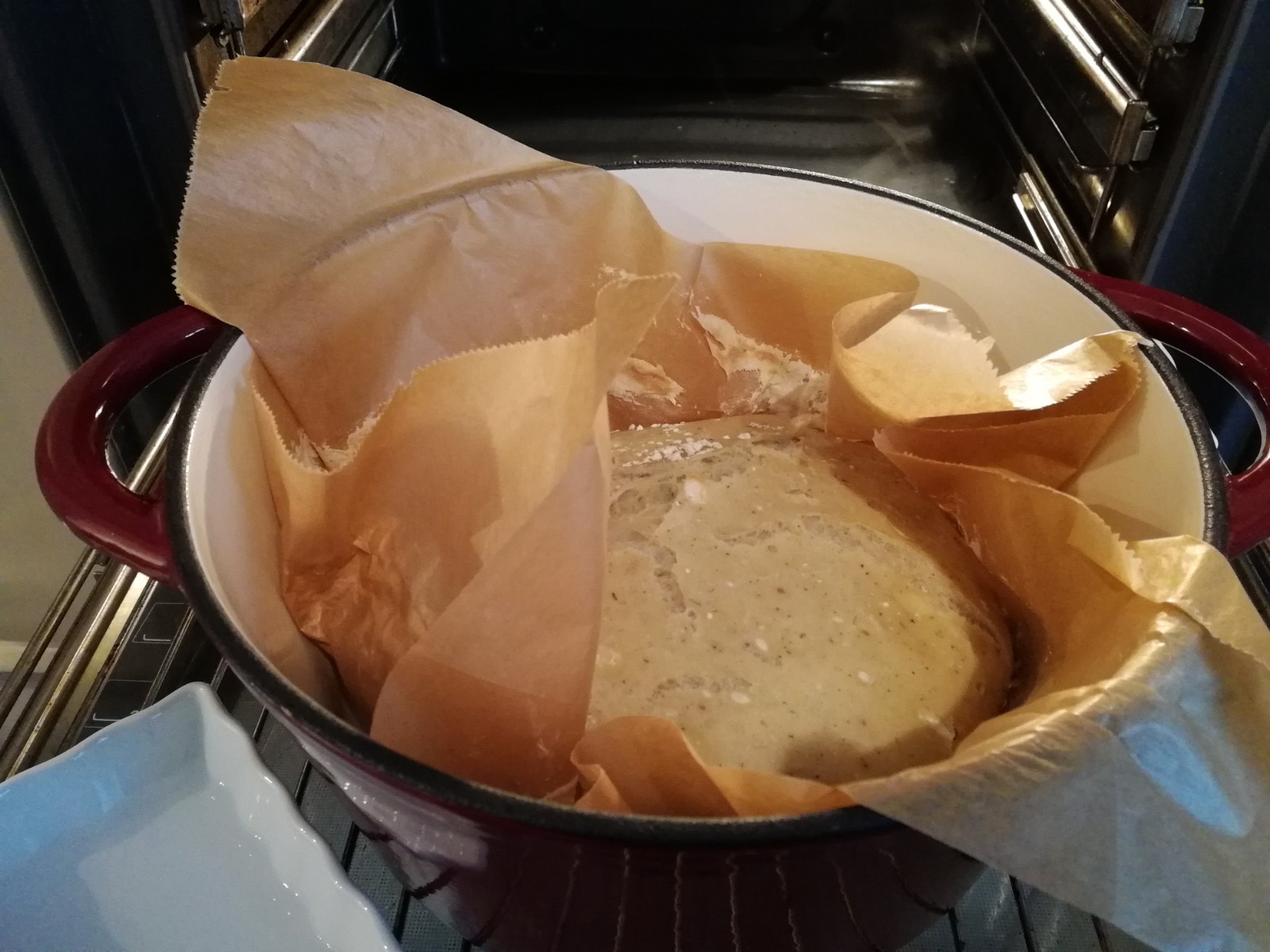Dann das Brot mit dem Backpapier in den Topf geben und den Deckel wieder verschließen.