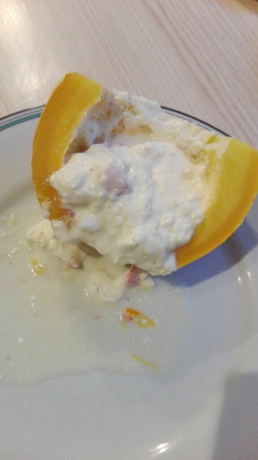 Wir hatten den Kürbis dann halbiert und mit der Füllung und den Kartoffeln und Paprikaspalten serviert.