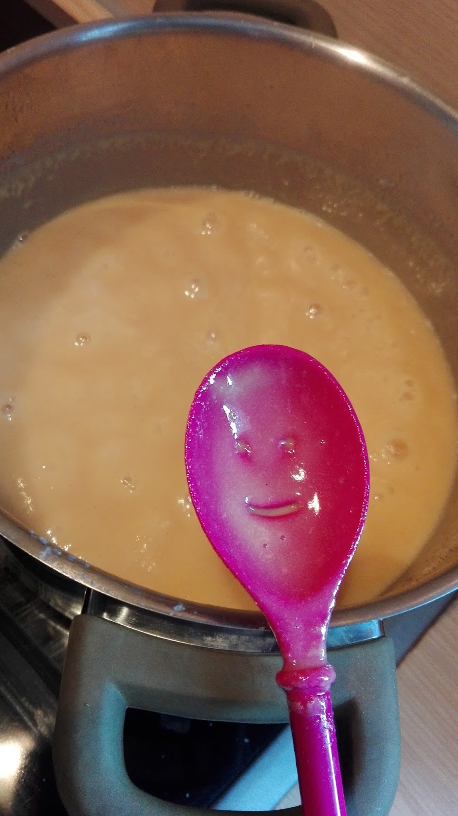 Die Masse wird auch langsam dicker. Wenn das Karamell die richtige Farbe hat, bzw. der Geschmack schon karamellig genug ist, den Topf vom Herd nehmen.