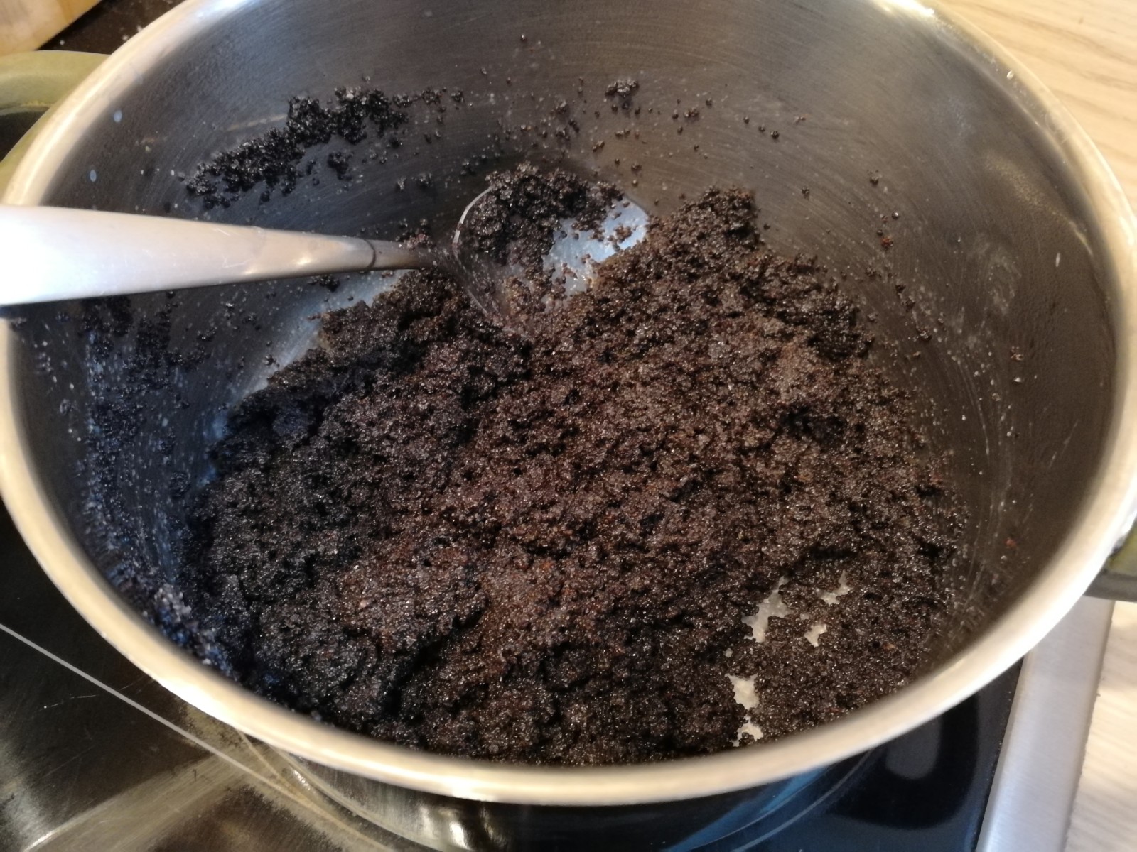 Nun den Mohn dazu geben und alles gut verrühren. Vom Herd nehmen und den Mohn quellen lassen.