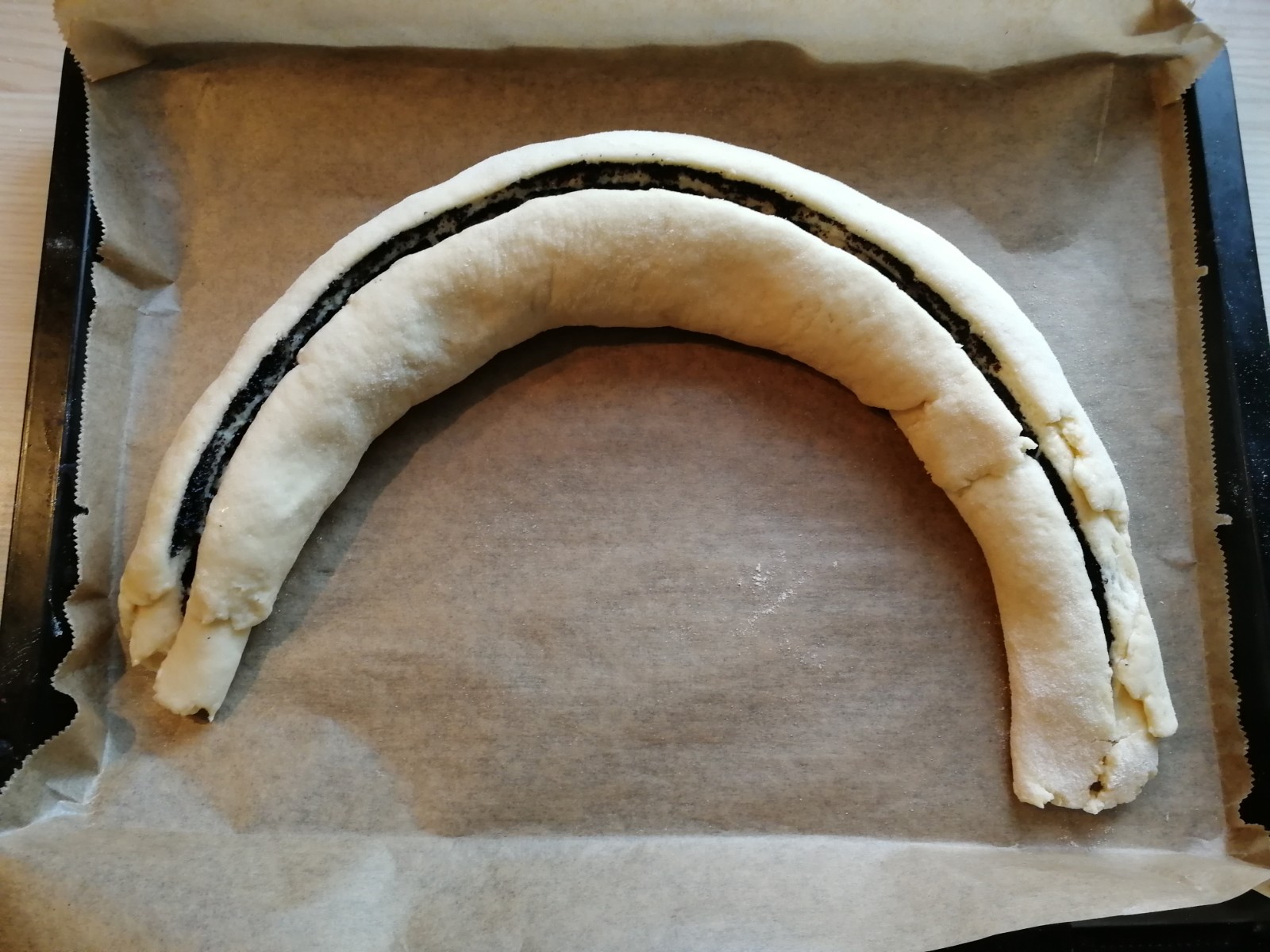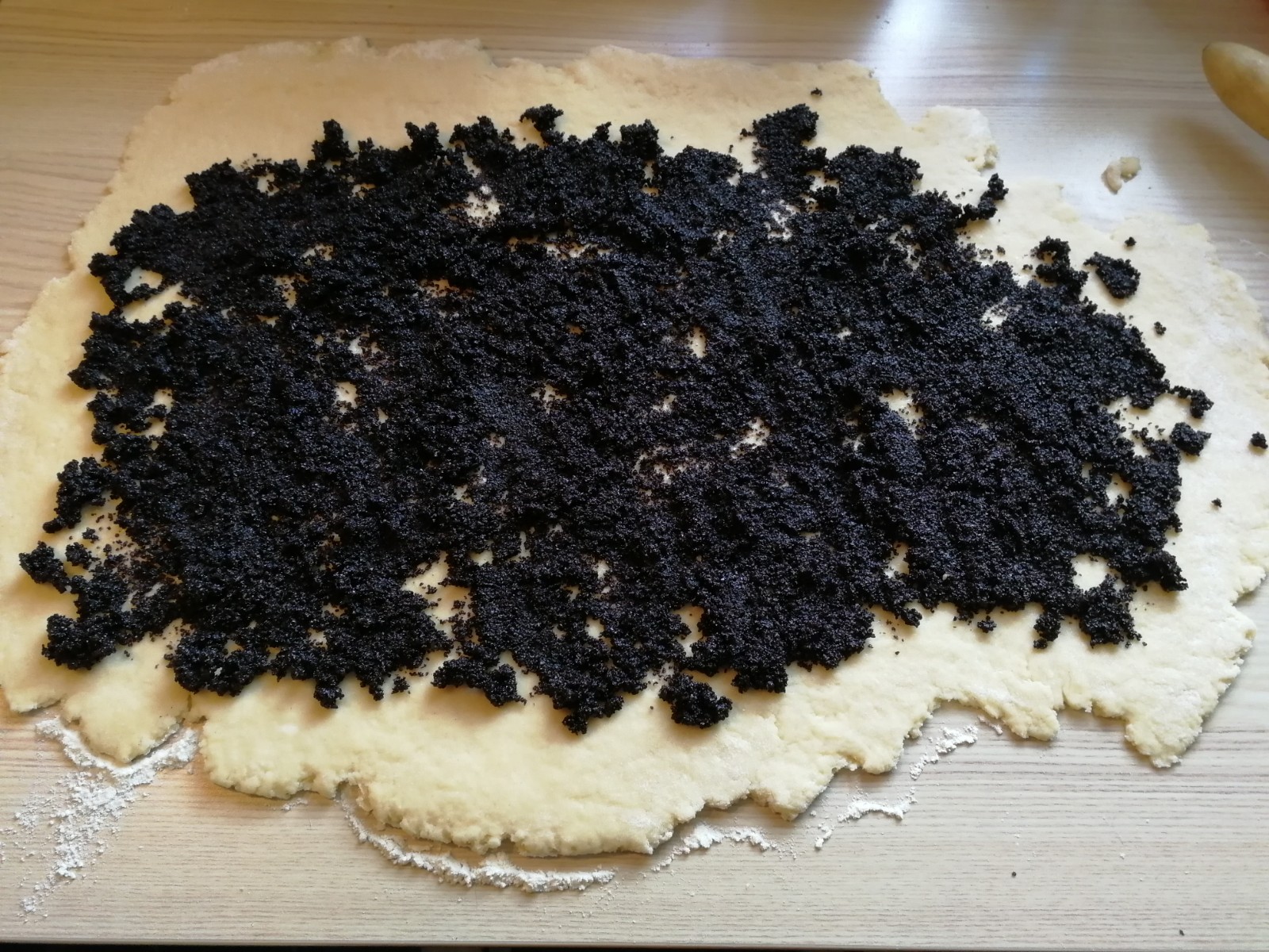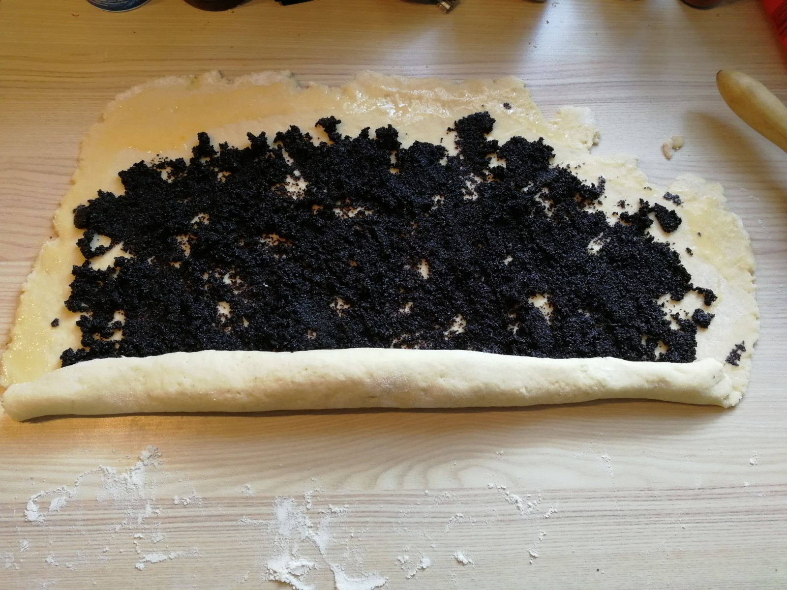 Den Teig auf der bemehlten Arbeitsfläche ausrollen. Nun die Mohnfüllung darauf verteilen, jedoch einen Rand ohne Füllung lassen.