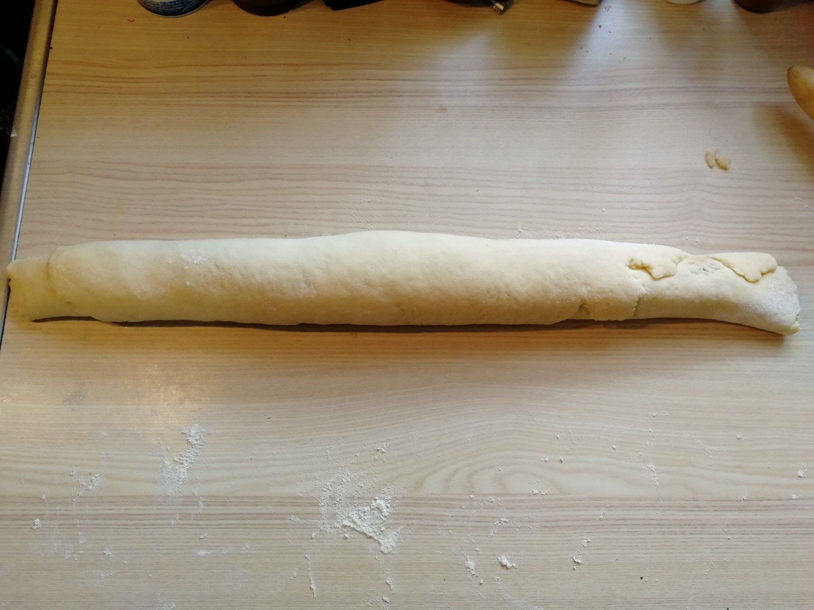 Nun langsam den Teig aufrollen, vorsichtig vorgehen, da der Teig leicht reißen kann. Den Teigstrang auf ein mit Backpapier belegtes Backblech legen. Mittig mit einem scharfen Messer einen Schnitt über den gesamten Strang ziehen.