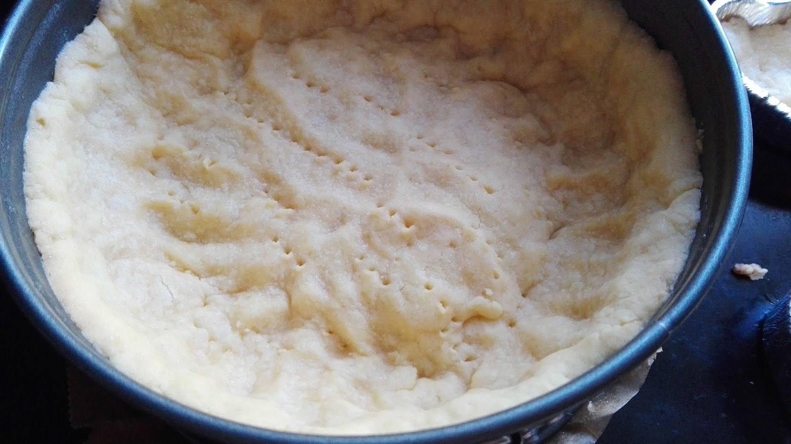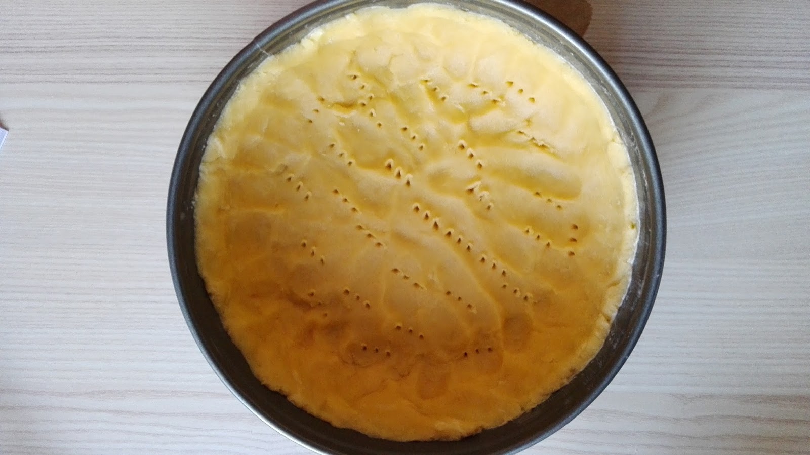 Streusel nun in der Form verteilen und einen Rand formen. Anschließend mit einer Gabel in den Teig einstechen, damit er sich beim backen nicht wölbt.