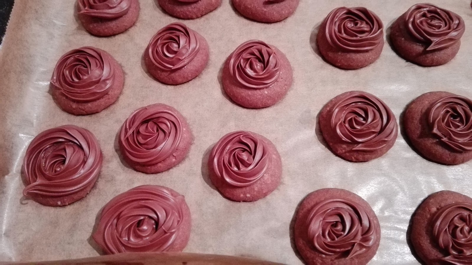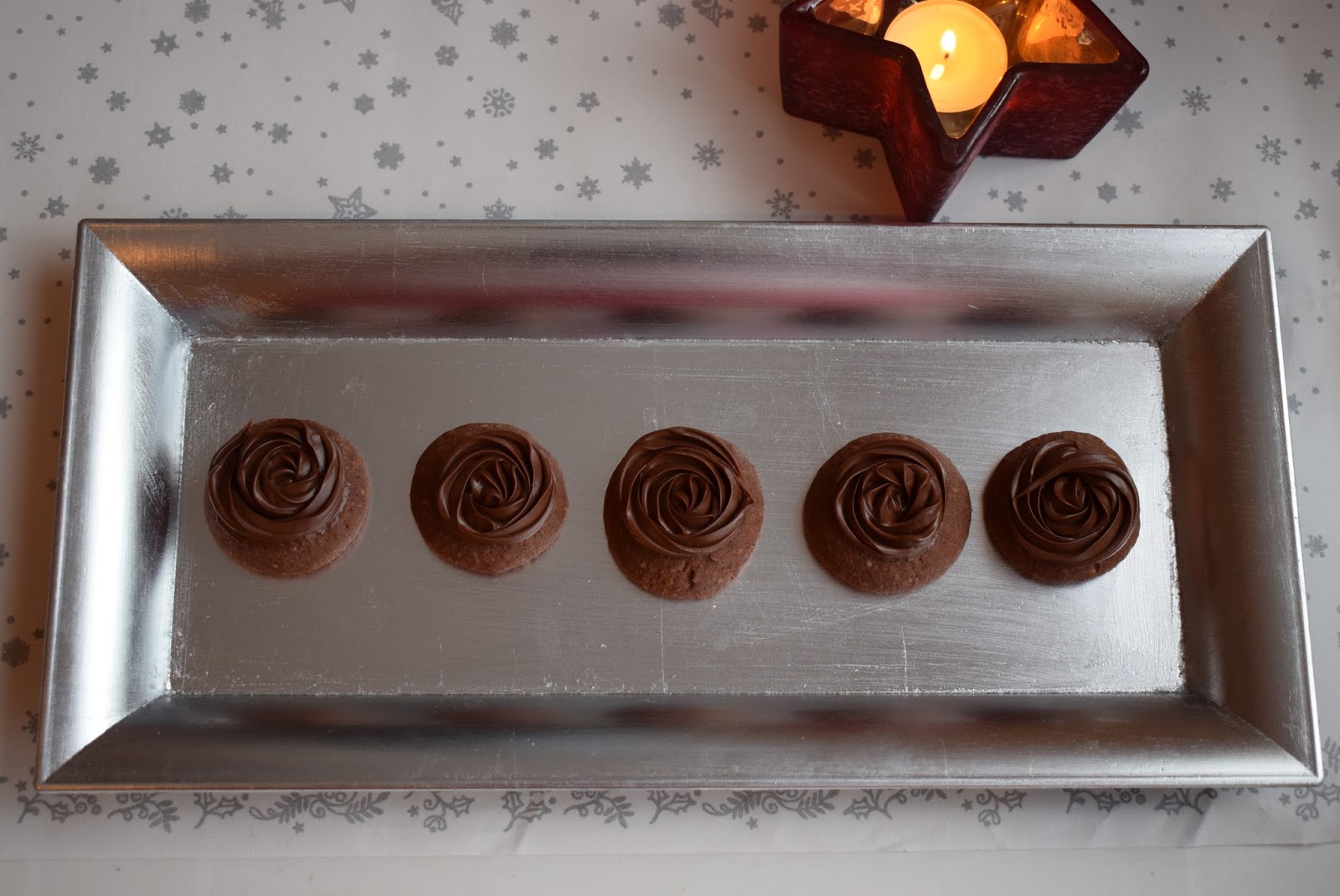 Nun Rosen auf die Plätzchen spritzen und komplett auskühlen lassen. Durch die Kuvertüre und das Palmin wird die Masse richtig fest, so dass man die Plätzchen gut lagern kann.