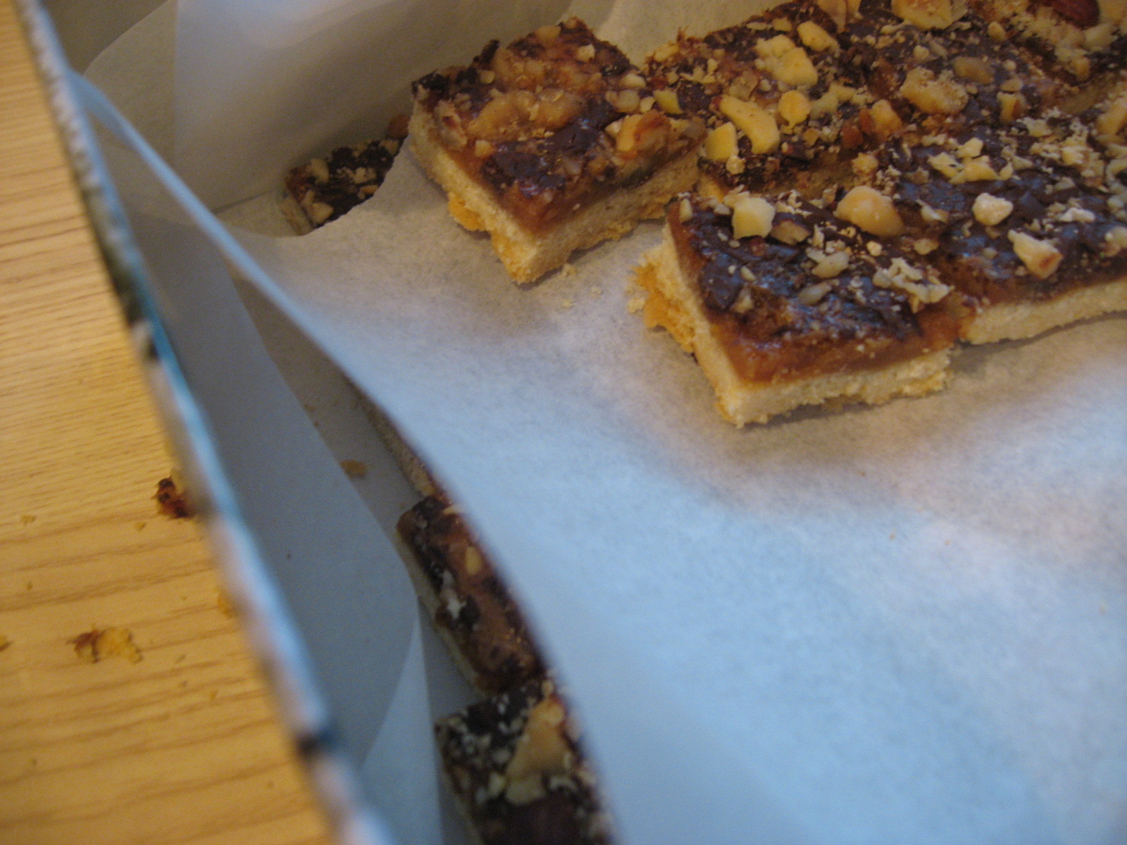 Jetzt geht es nochmals für 25 Minuten in den Ofen. So wird die Karamellcreme wieder fest und bindet so Schokolade und Nüsse mit ein.
