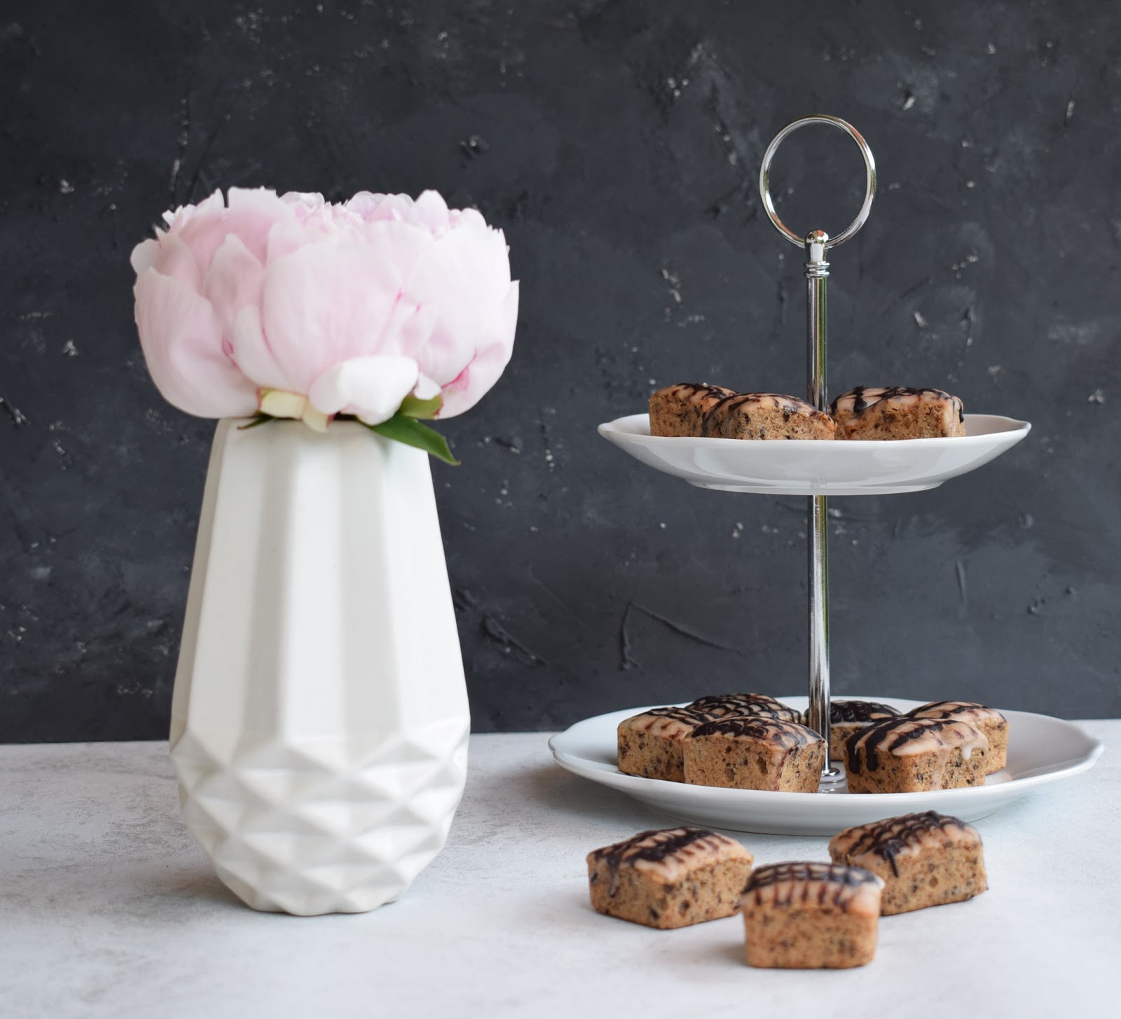 Erst den hellen Guss auf die Kuchenstücke geben, dann mit einem Spritzbeutel dünne Linien mit dem Kakaoguss darauf geben und mit einem Zahnstocher ein Muster ziehen.