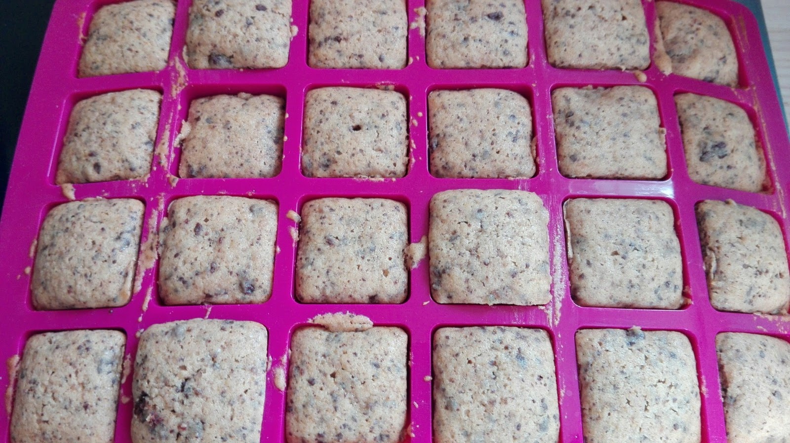 Die Kuchenstücke schmecken leicht nach Orange und haben eine feine Note von Zartbitterschokolade. Auch lecker für einen normalen Kuchen, dann aber natürlich mit einer erhöhten Menge.