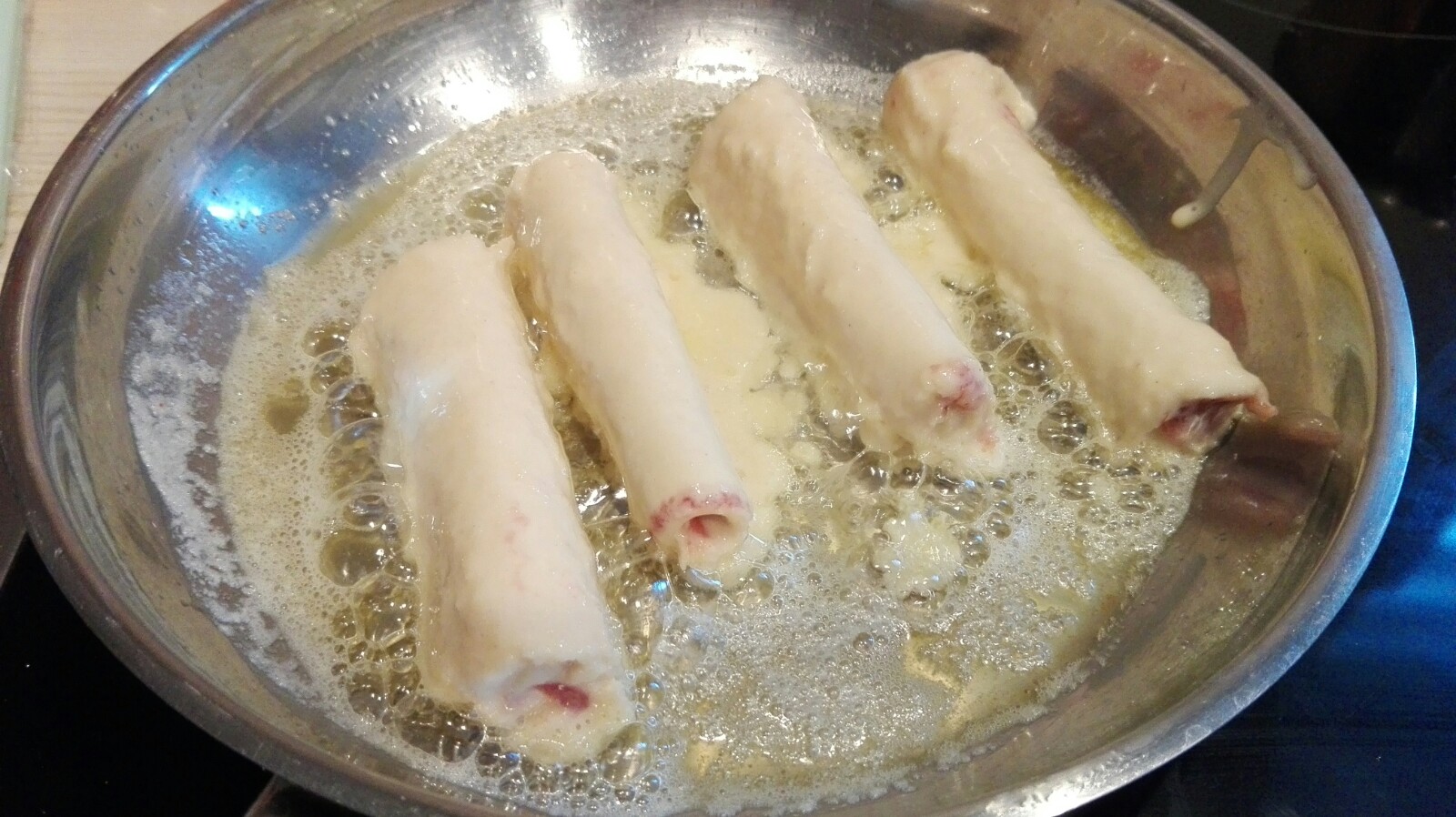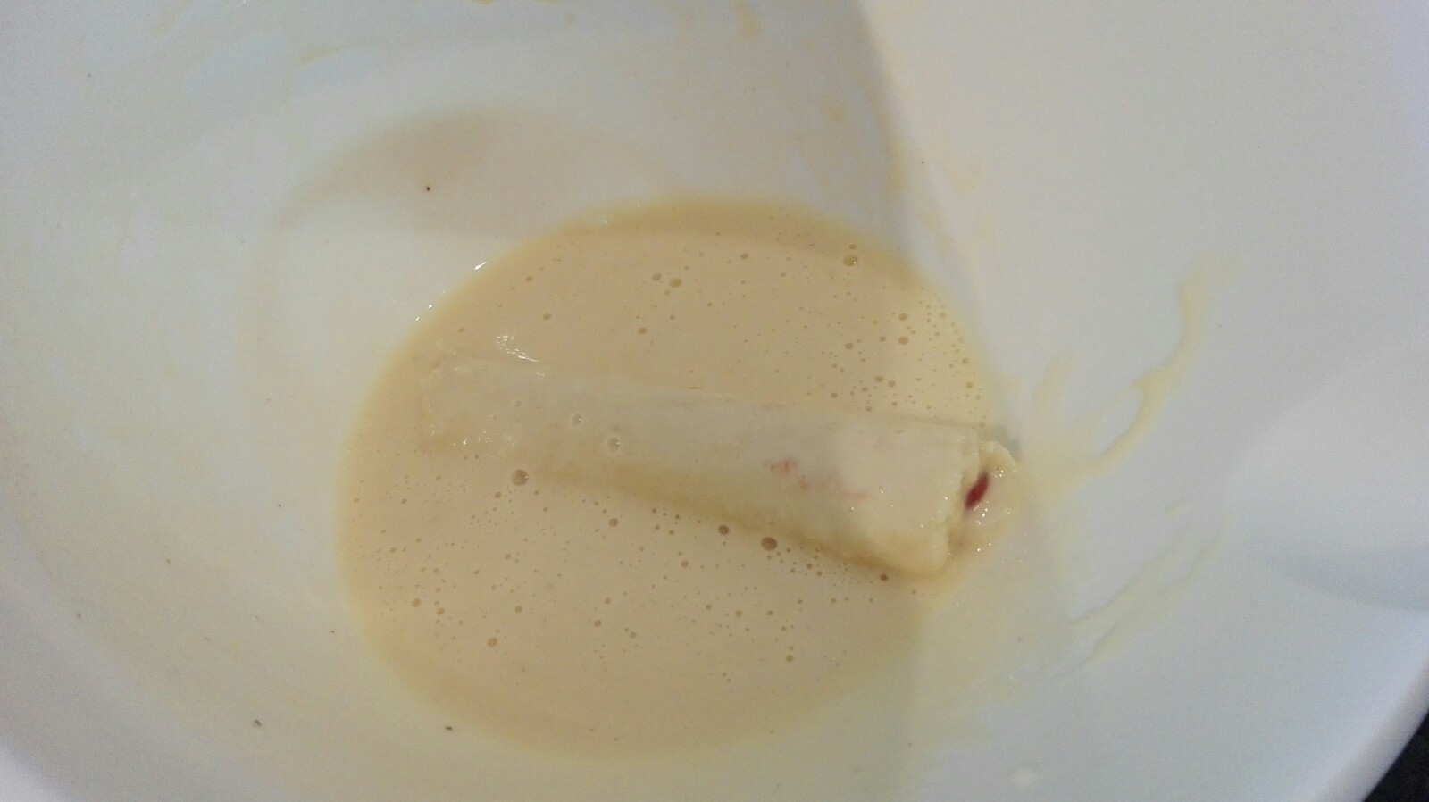 Pfannkuchenteig nochmals kurz durchrühren und dann die Pancake Rolls hineinlegen und wenden, so dass die komplette Rolle mit Pfannkuchenteig ummantelt ist.