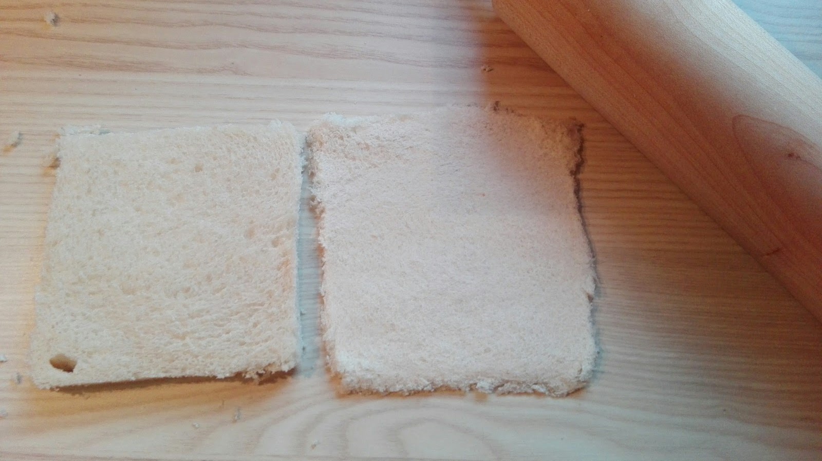 Mit einem Nudelholz die Toastscheiben platt drücken