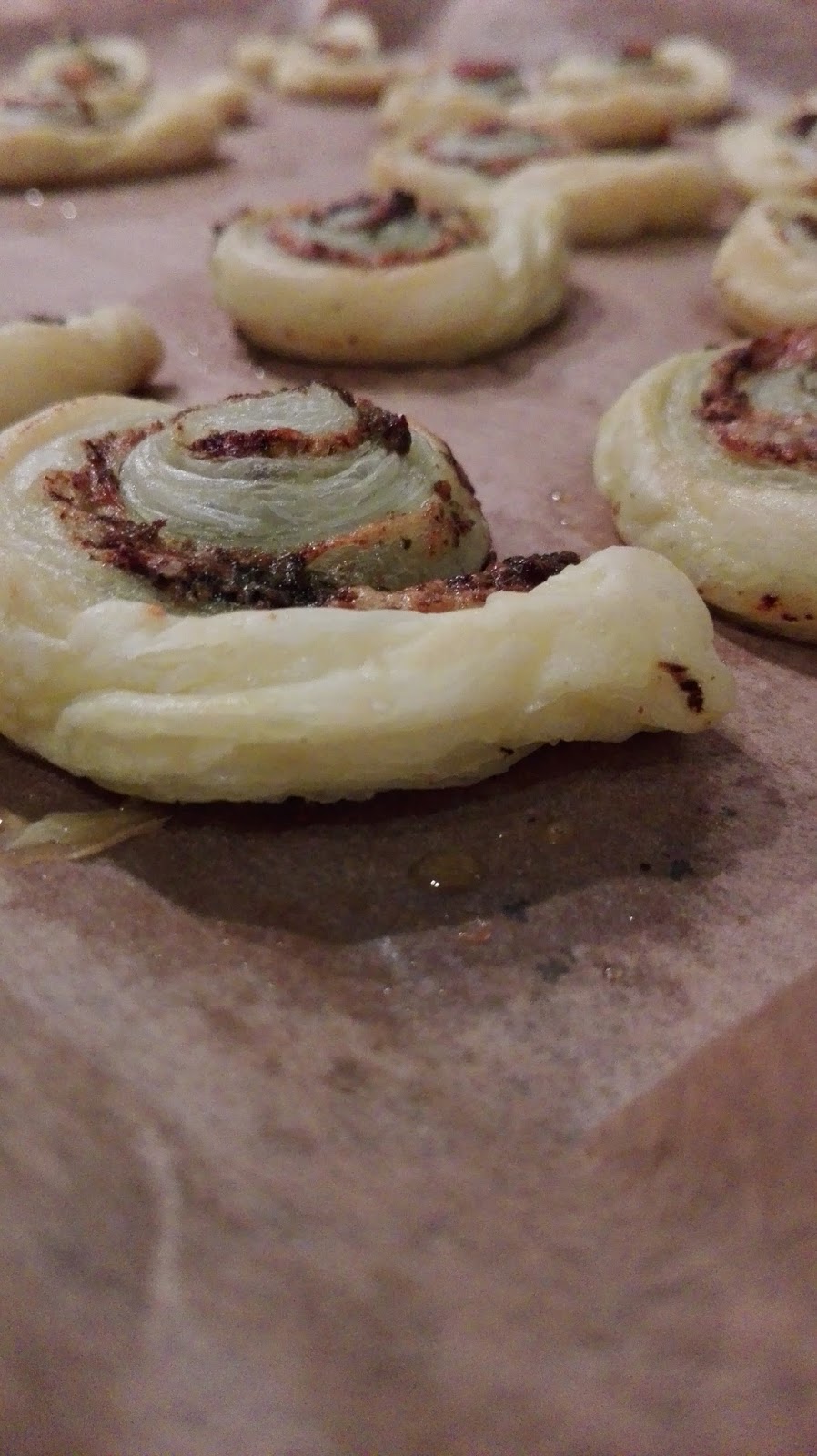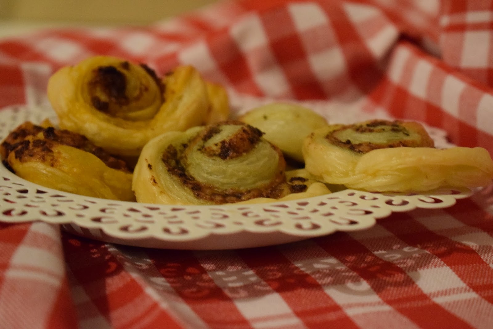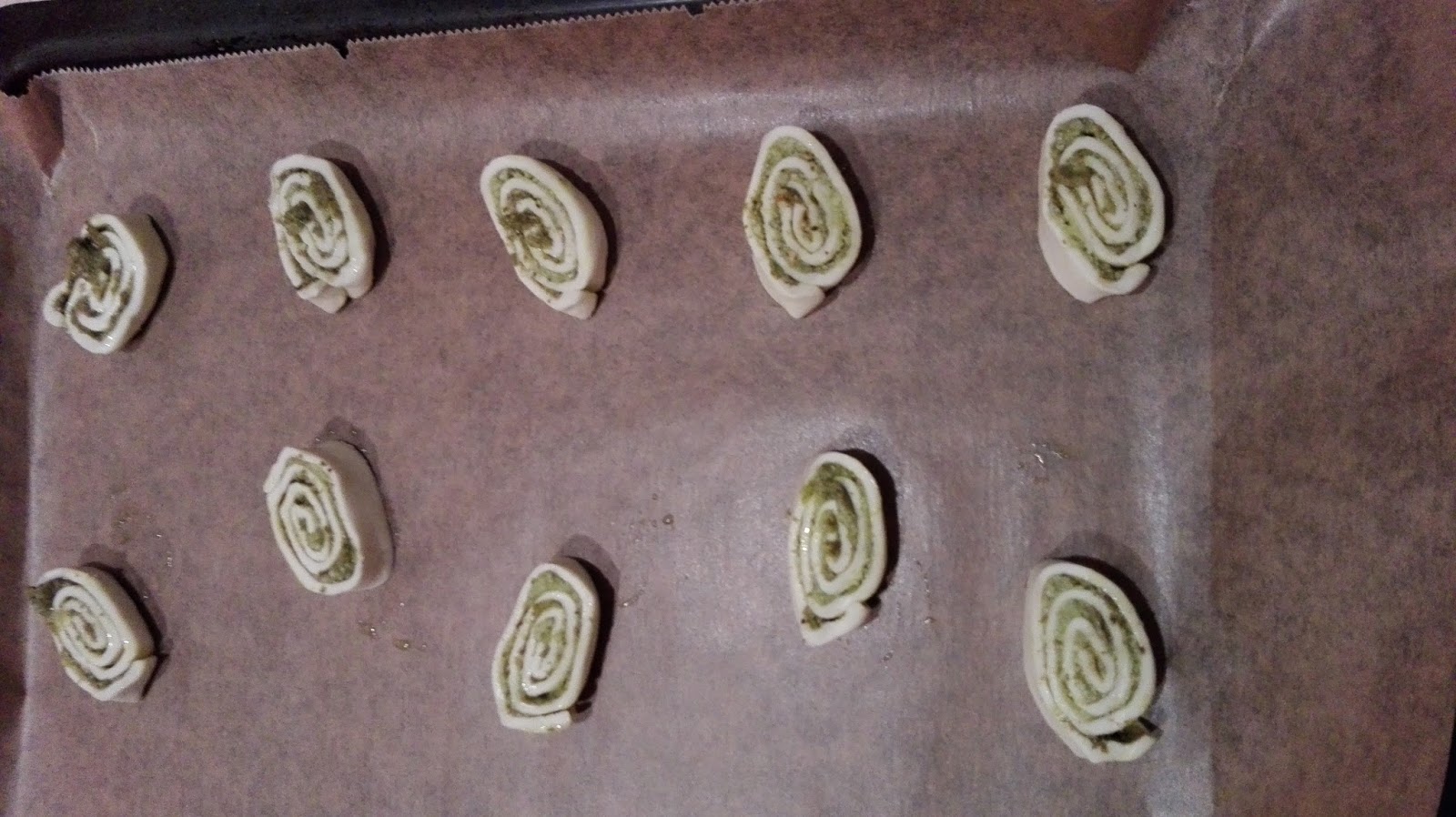 Den Blätterteig einfach aufrollen, mit Pesto bestreichen (den oberen Rand freilassen, damit die Schnecken danach nicht aufgehen) etwas Parmesan darauf verteilen und dann rollen.