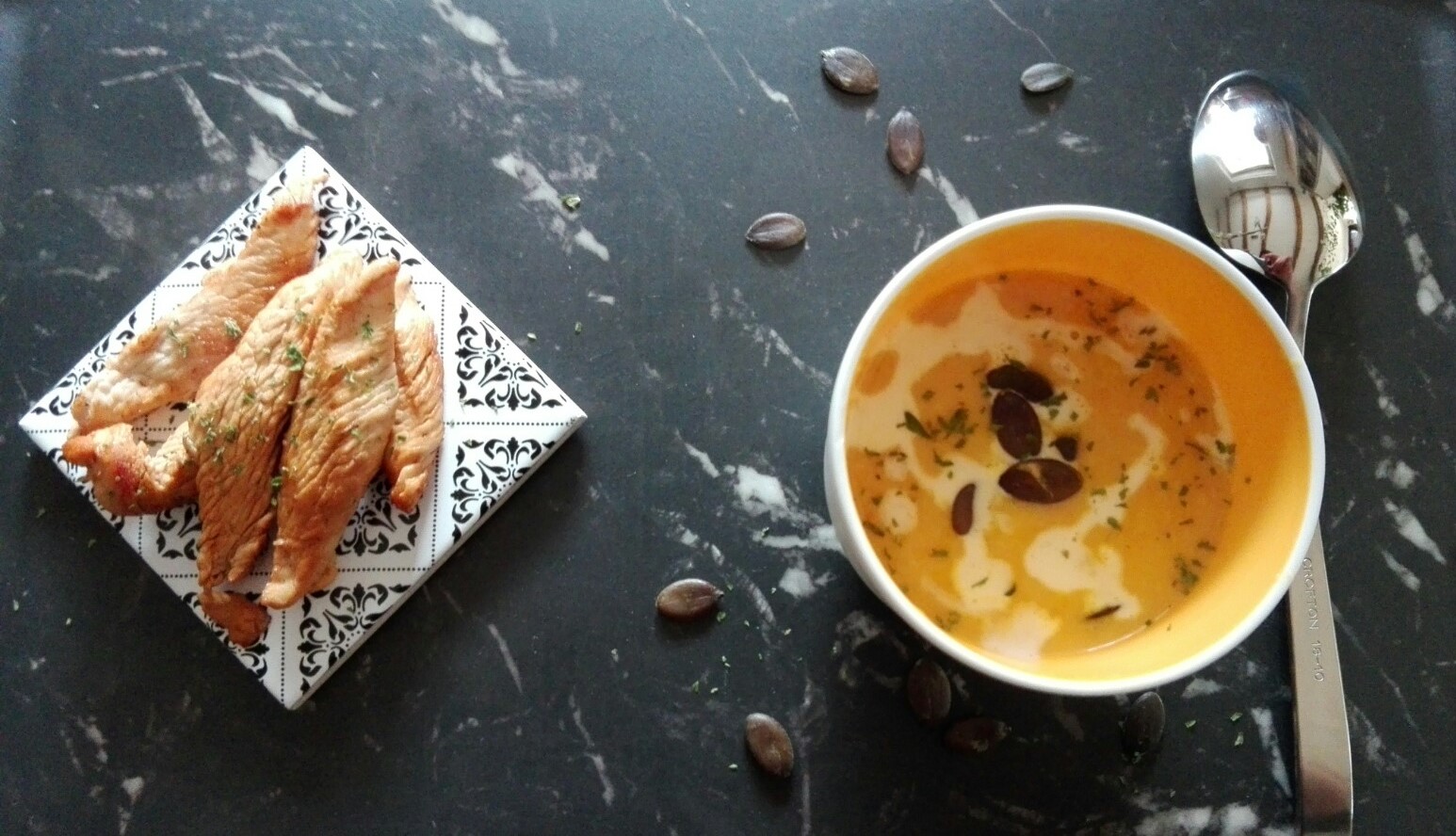 – Kürbiscremesuppe mit Pute und gerösteten Kürbiskernen