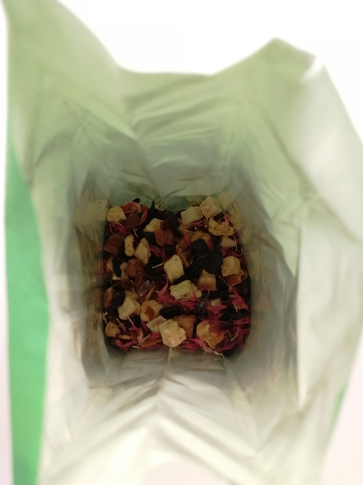 Eine richtig tolle Fruchtmischung. Mehr Frucht in einem Tee geht nicht. Bei dem Geruch merkt man, dass eine leichte Note von Rose durchkommt. Bei dem Blick auf die Zutatenliste sieht man sie auch die Rose. Sie ist später im aufgebrühten Tee nicht mehr groß zu schmecken, aber beim Geruch des losen Tees merkt man sie doch deutlich. Auch beim Blick in die Packung sieht man ganz viele Rosenblüten.