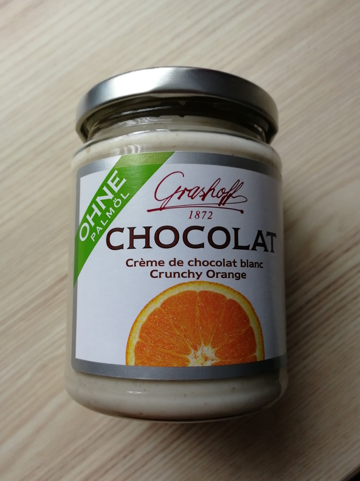 Schokoladenaufstrich von Grashoff – Weiße Chocolat Crunchy Orange.