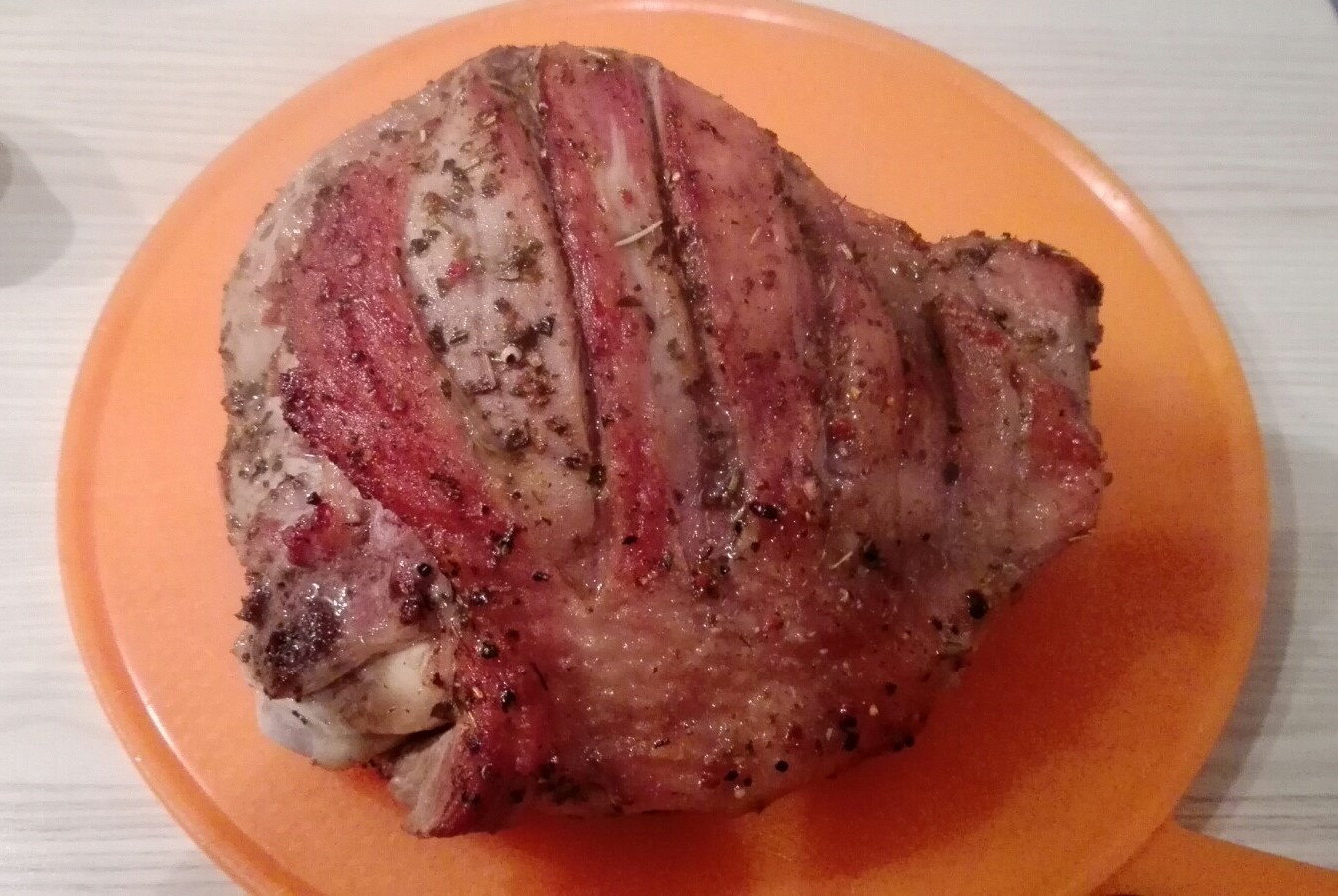 Immer wieder etwas Brühe über die Keule geben, so wird sie etwas knuspriger.
