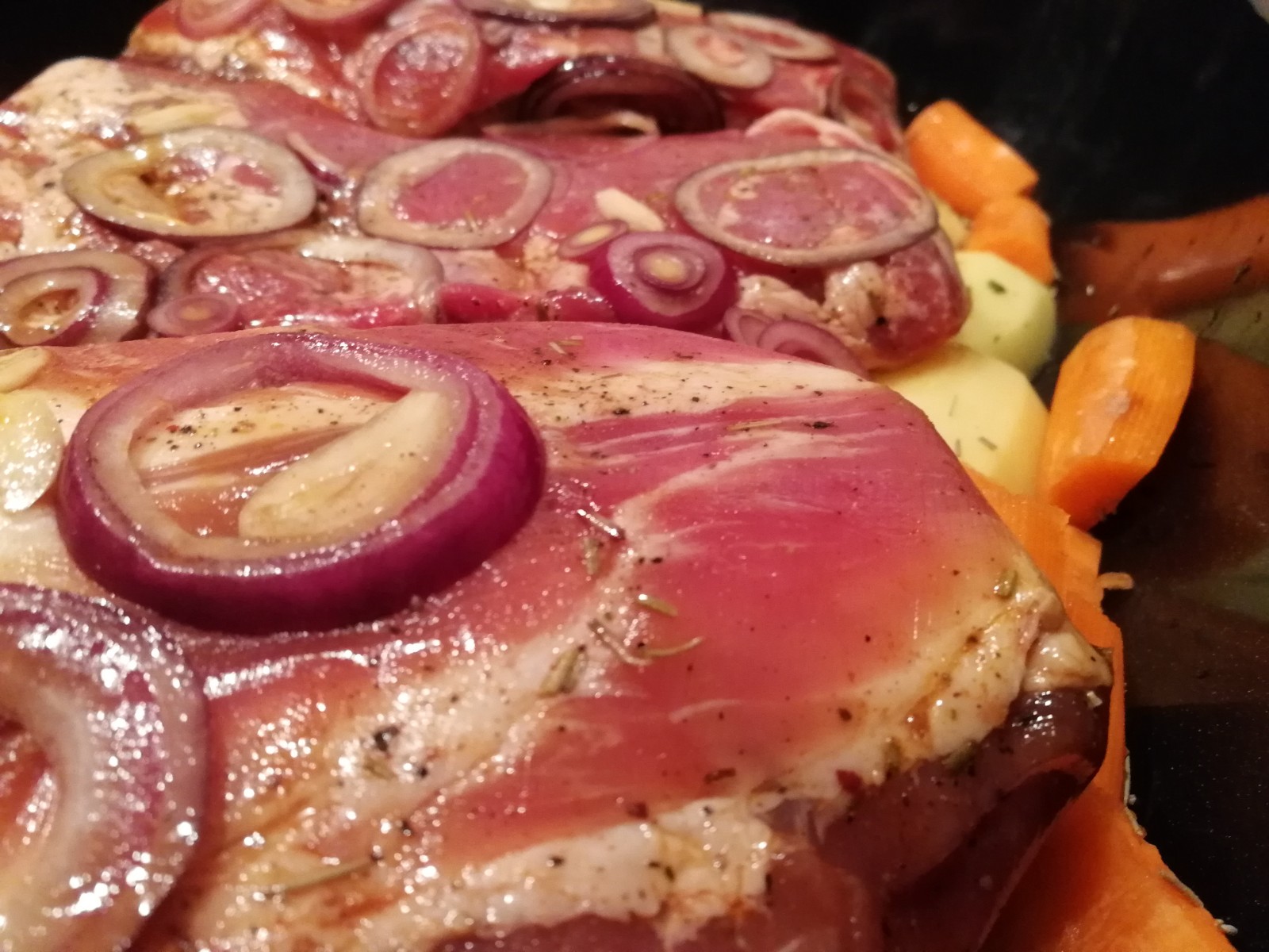Die Rippchen mit Marinade und Zwiebeln und Knoblauch auf die Kartoffeln/Karotten legen.