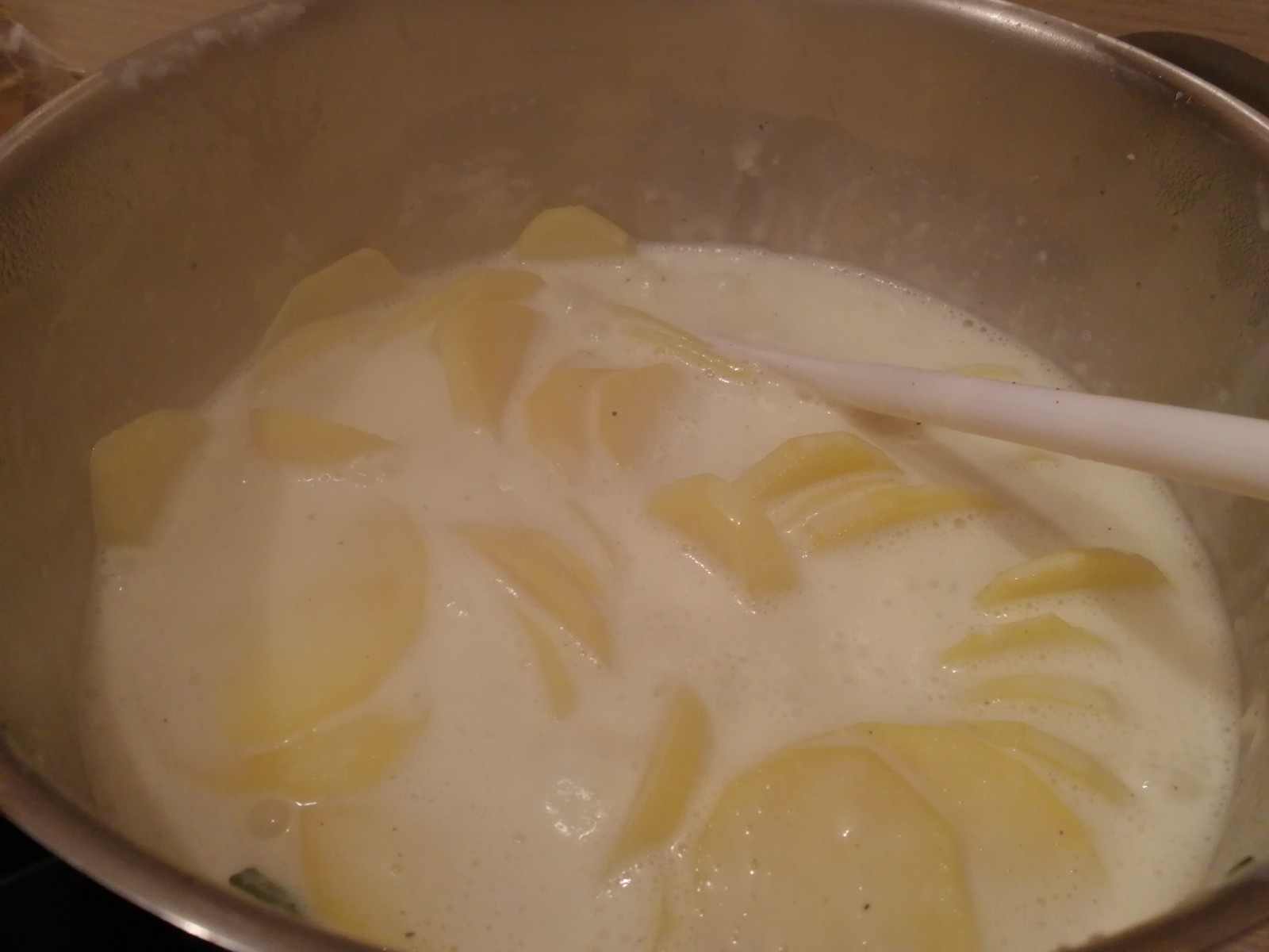 Nun die Kartoffelscheiben dazu geben und kurz aufkochen lassen und dann für ca. und ständigem Rühren 10 Minuten köcheln lassen.