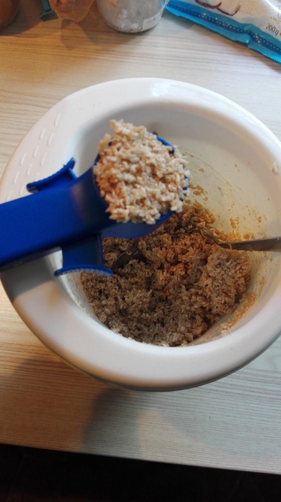 Eiweiß mit einer Gabel auflockern und dann unter die Kokosmischung geben und gut vermengen.