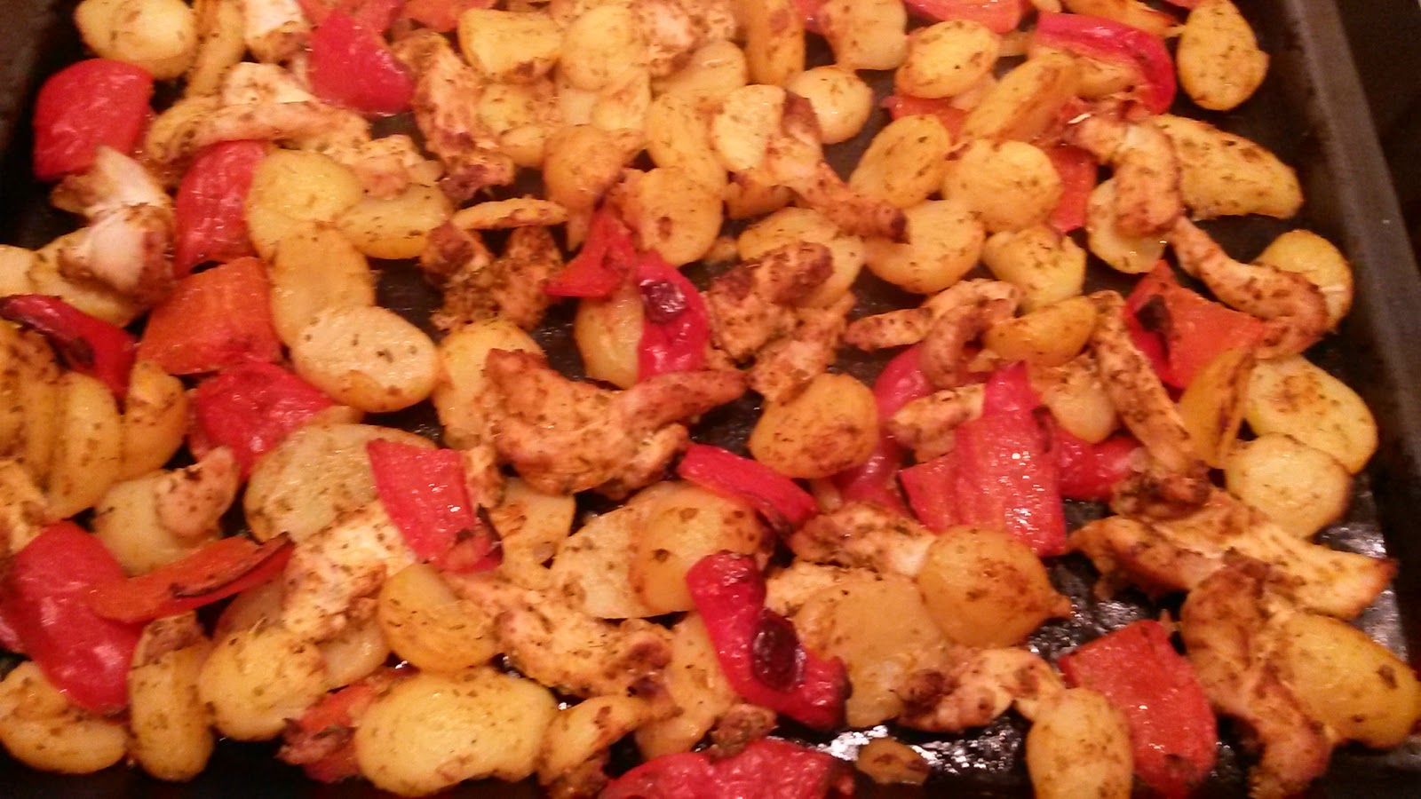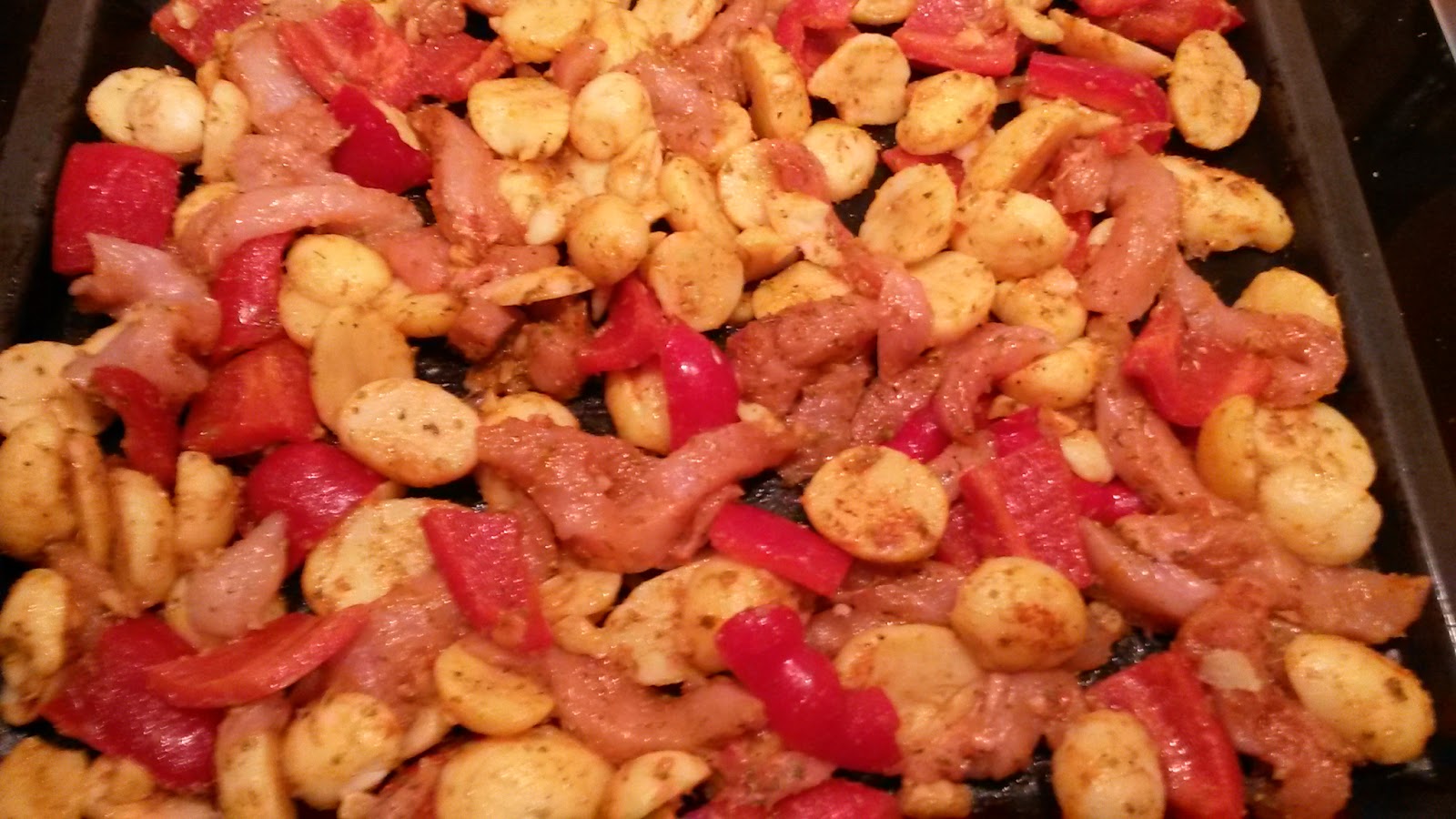 Kartoffeln waschen und halbieren. Paprika ebenfalls waschen und in große Stücke schneiden. Putenfilet in Streifen schneiden. Alles zusammen in eine große Schüssel geben und mit etwas Öl vermischen. Mit Salz, Pfeffer, Paprikapulver und Oregano würzen und gut durchmischen.