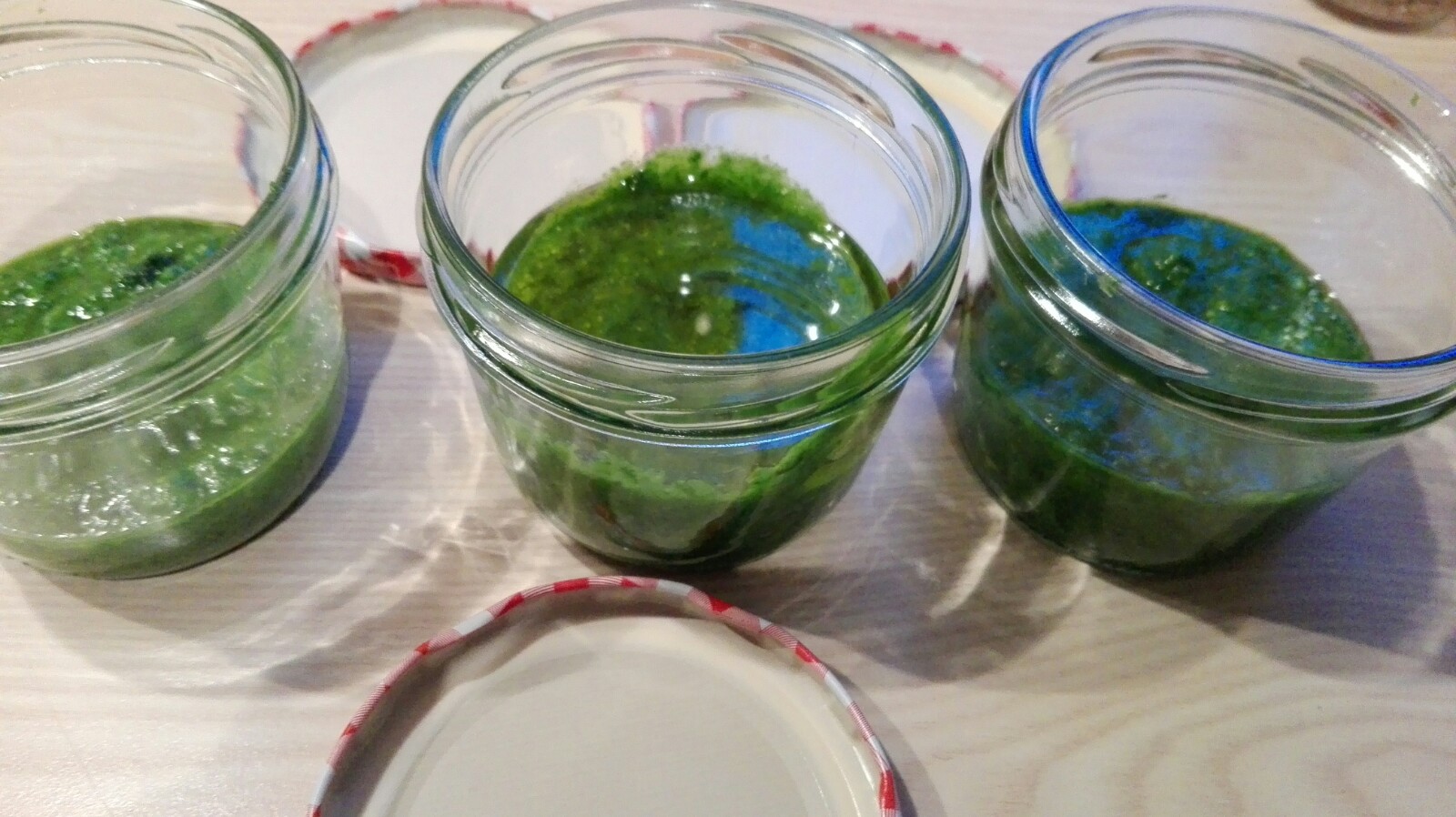 Ich hatte es in etwas mehr Gläser gefüllt und nicht so viel eingefüllt, damit das Pesto schnell aufgebraucht wird und nicht zu lange dann offen steht.