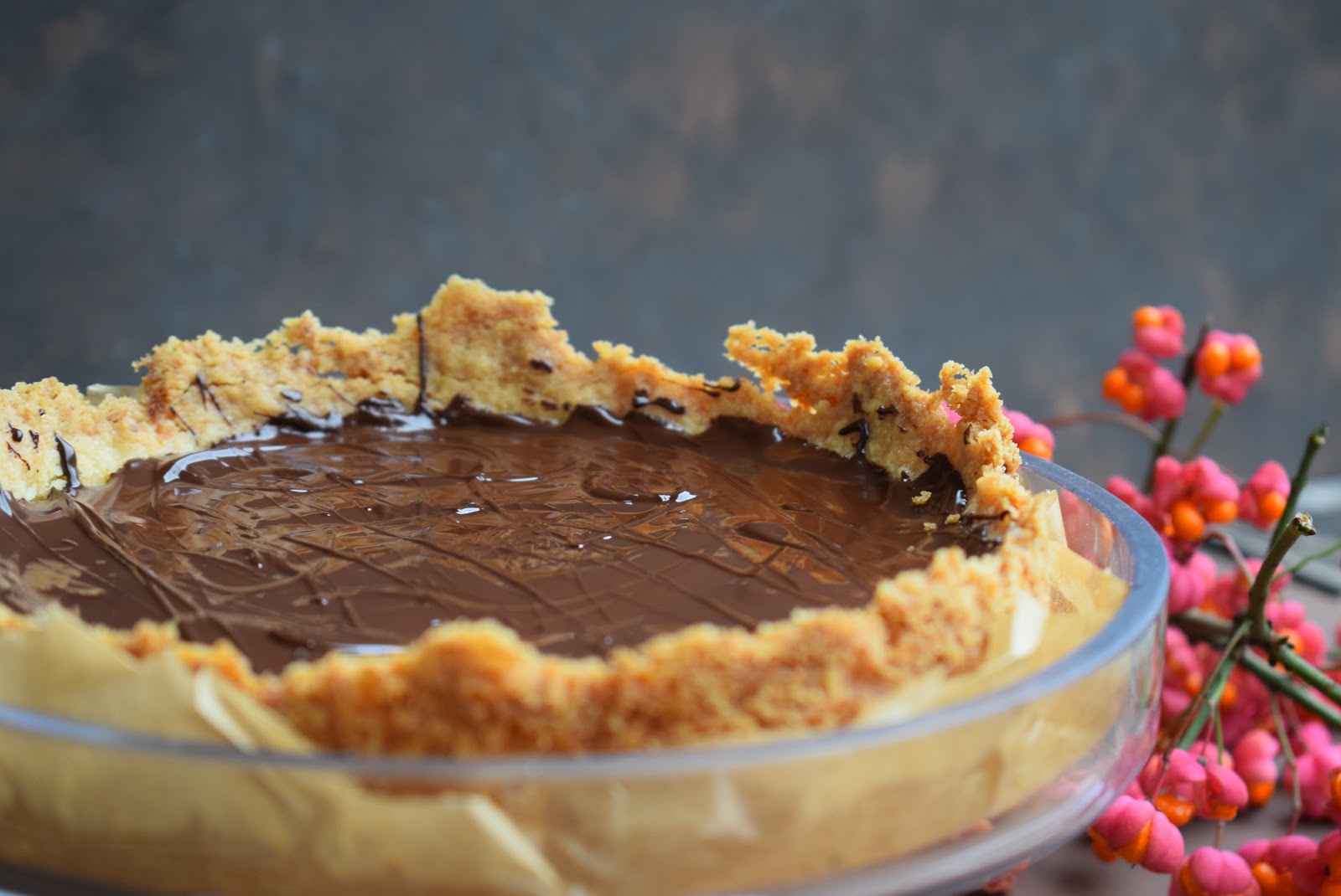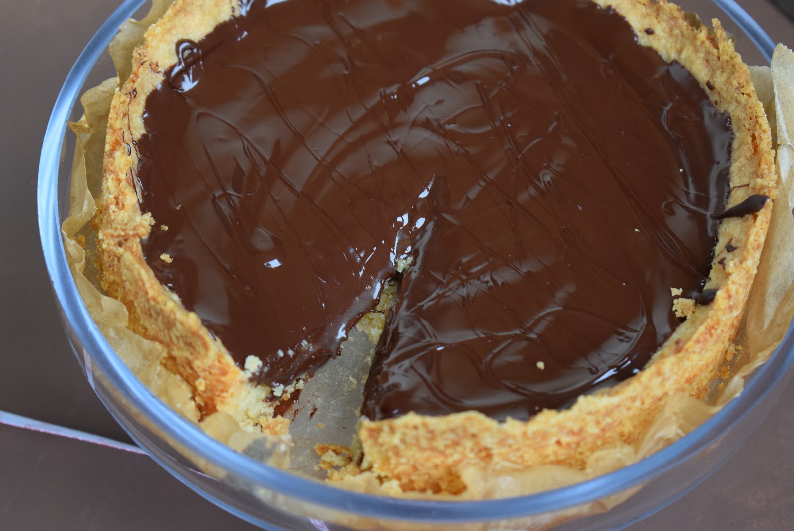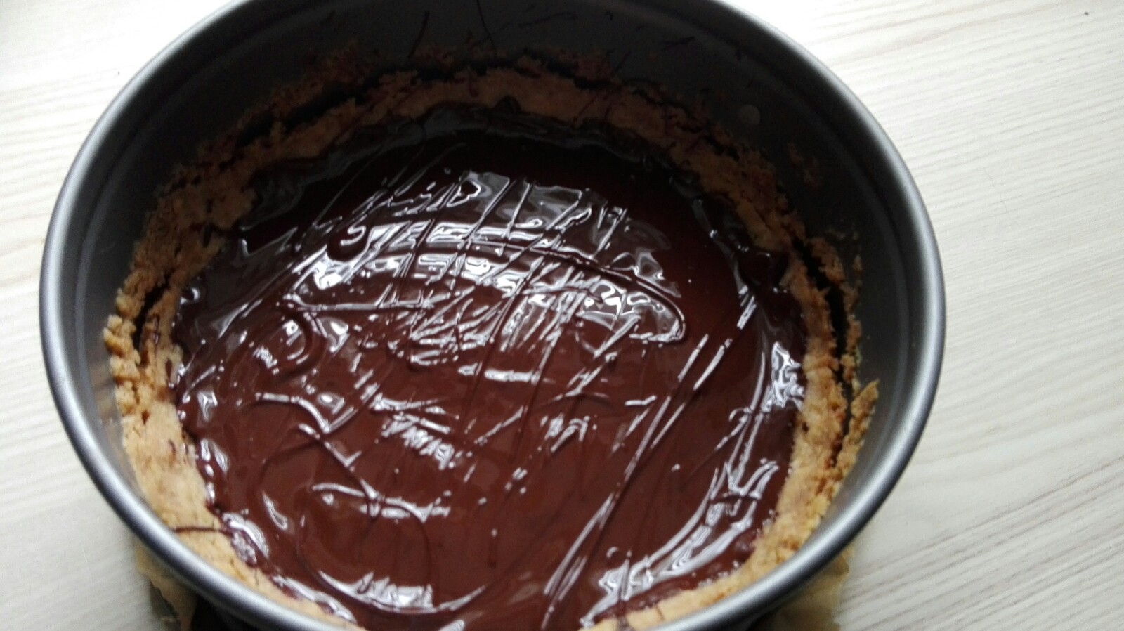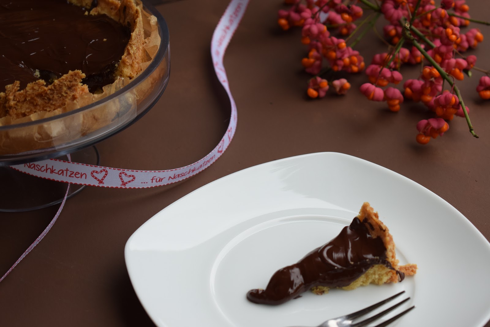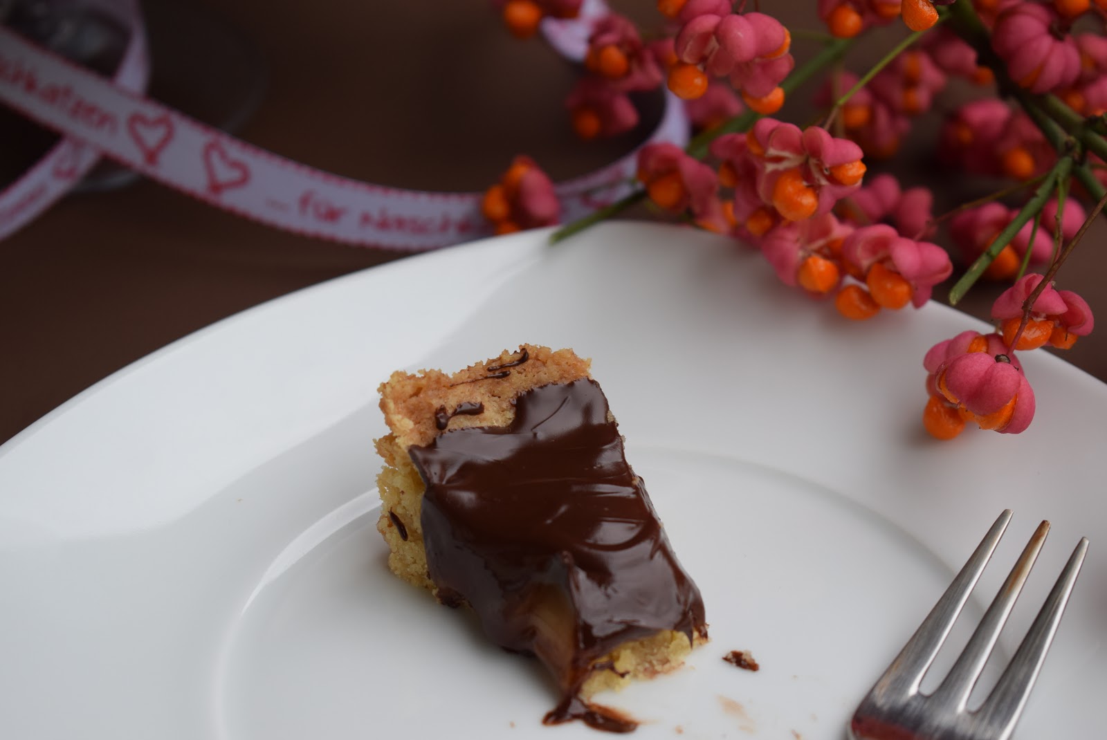Wenn das Karamell abgekühlt ist kann nun der Schokoguss vorbereitet werden. Dafür die Schokolade im Wasserbad schmelzen und auf den Kuchen geben und gut verteilen.